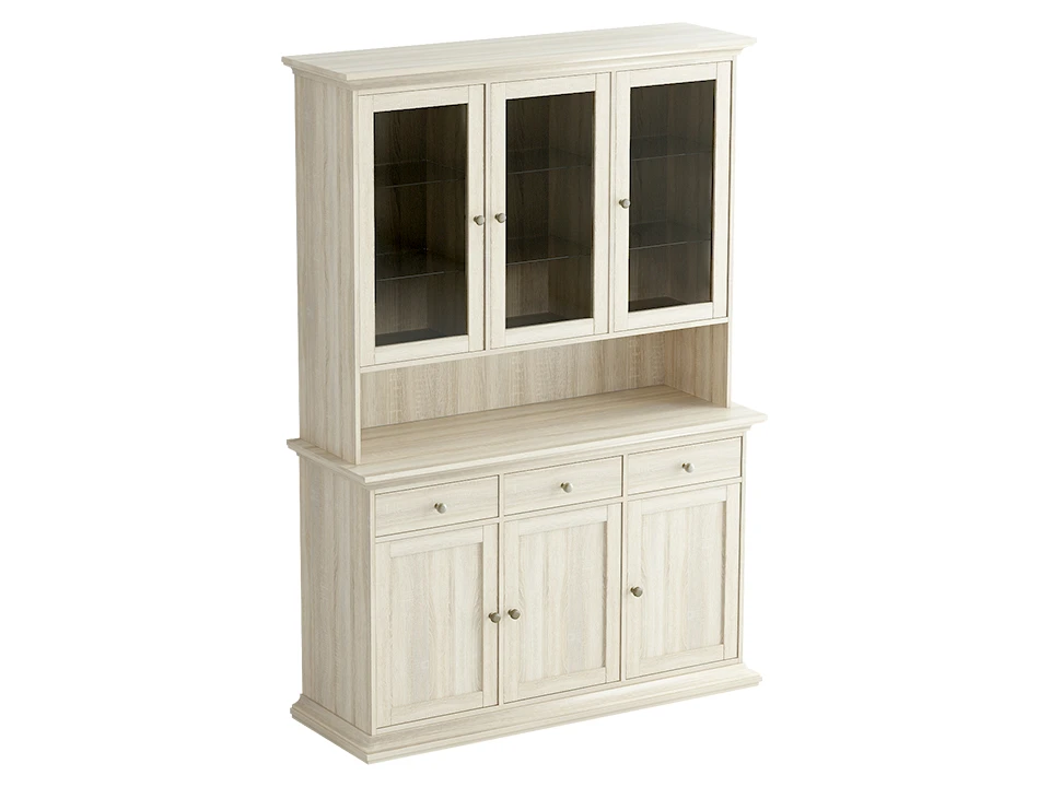 Этот буфет представляет собой идеальное место для хранения вашей посуды благодаря двум отделениям. В верхнем отделении за стеклянными дверцами располагаются полки, где вы сможете разместить красивые сервизы или бокалы. Нижнее отделение оснащено выдвижными ящиками и отделениями с полками за деревянными дверцами, что позволяет удобно хранить более практичные вещи. Изготовленный из ЛДСП, буфет отличается прочностью и долговечностью, а также придаёт мебели современный вид, который легко впишется в любой интерьер.