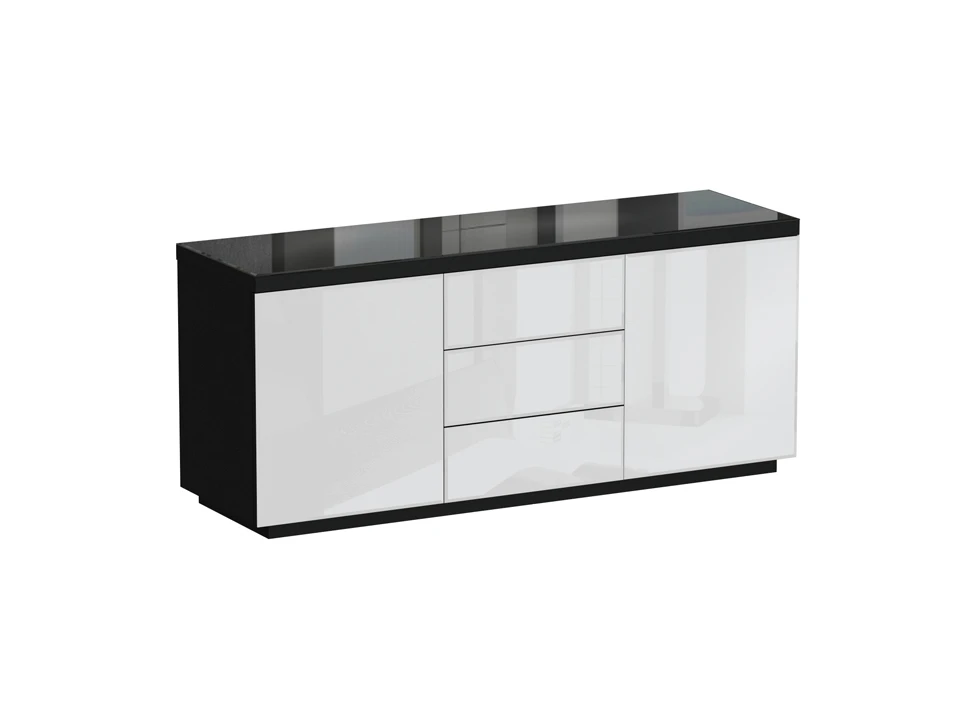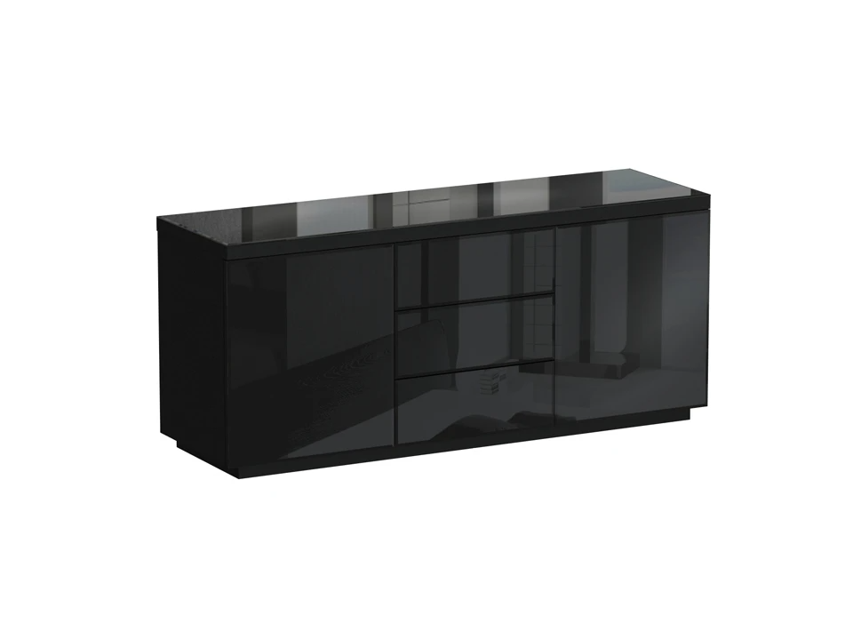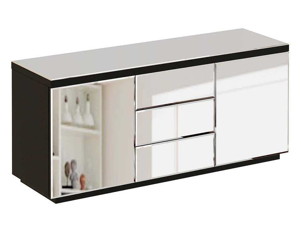 Лаконичные изделия помогут организовать хранение одежды, текстиля, канцелярии, косметики, техники и других вещей. В интерьере возьмут на себя роль практичных помощников с эффектным акцентом. Сервант с тремя отделениями. В левом и правом отделениях - съемные полки. В центральном отделении - три выдвижных ящика. Двери, фасадные ящики и верхняя поверхность декорированы стеклом. Двери и ящики открываются по принципу «нажал - открыл».
