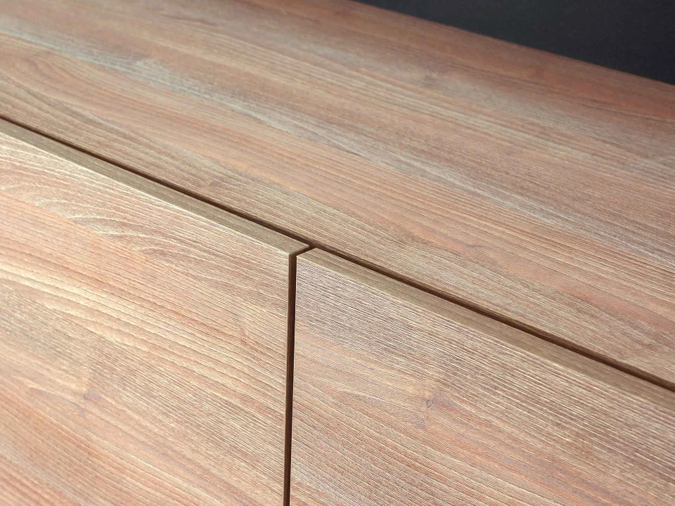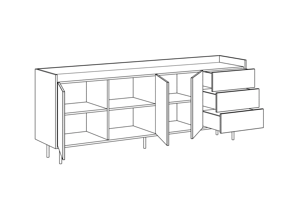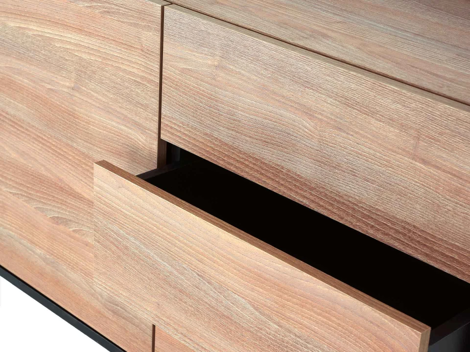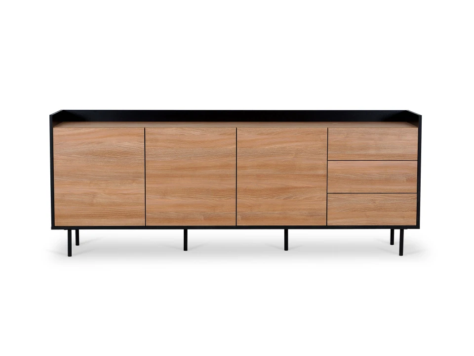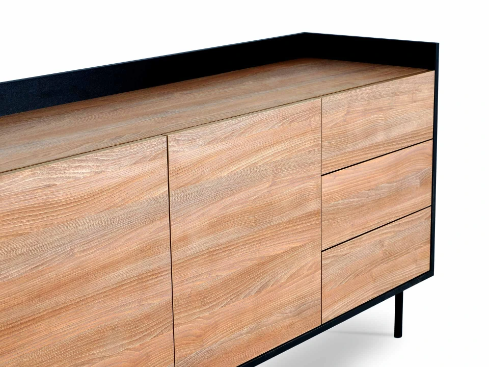 Особенность линейки заключается в контрасте элементов. Скругленные изящные металлические ножки поддерживают внушительное основание. При этом внешний вид моделей остается лёгким и элегантным. Также игру противоположностей усиливают древесная текстура на фасадах и черный цвет боковин с задней стенкой. Что придаёт большей динамики и выразительности дизайну. Эксклюзивность и завершенный вид воссоздает рамка, возвышающаяся над верхним горизонтом. Минималистичный вид конструкциям обеспечивает скрытая фурнитура. Двери и ящики открываются плавно, без шума и усилий. Комбинируйте комоды и серванты Look для создания целостного образа интерьера.