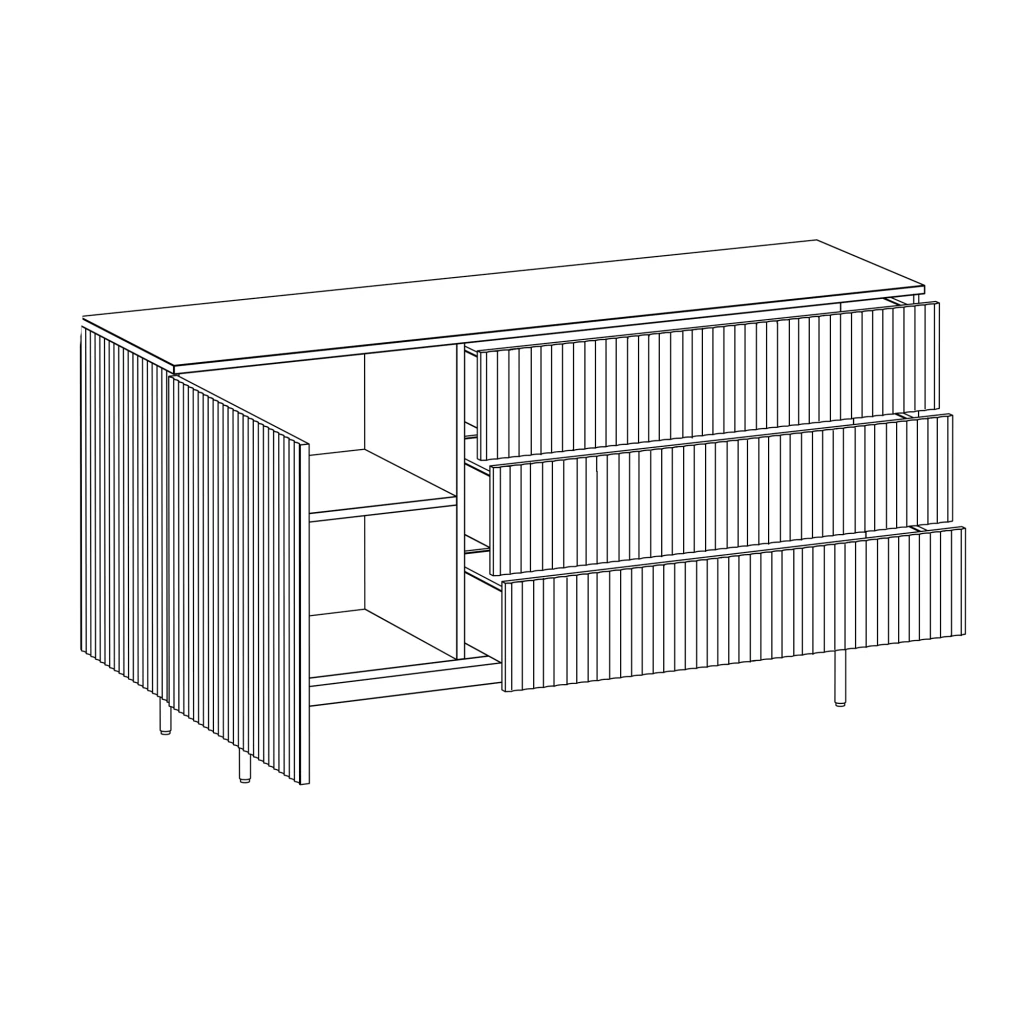 Сервант Mikko разделен вертикальной перегородкой на два отделения, левое за распашной дверью, в правом три ящика на скрытых направляющих, дно ящиков из ЛДСтП 16мм. За дверью одна съёмная полка, перестановка полки по высоте не предусмотрена.