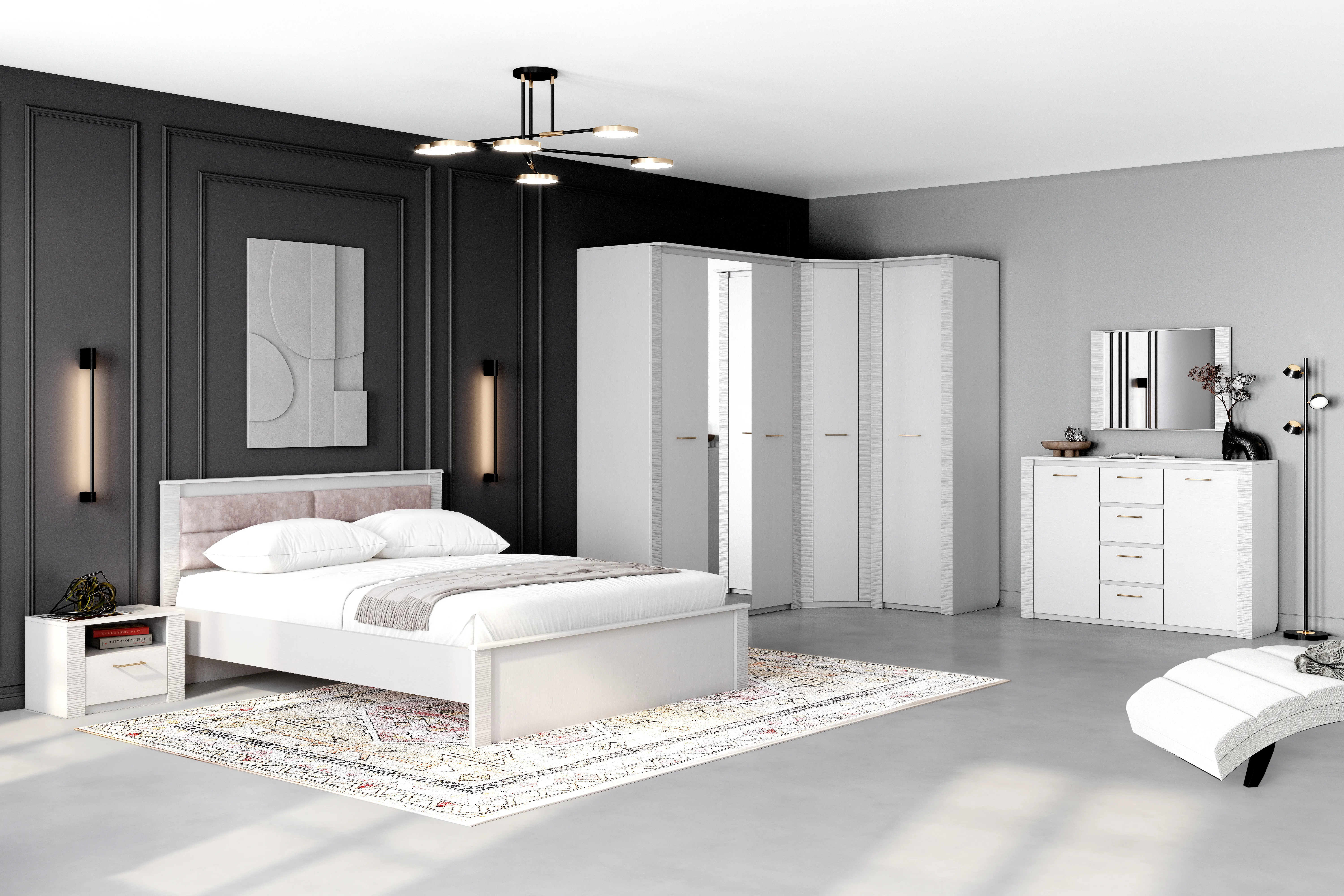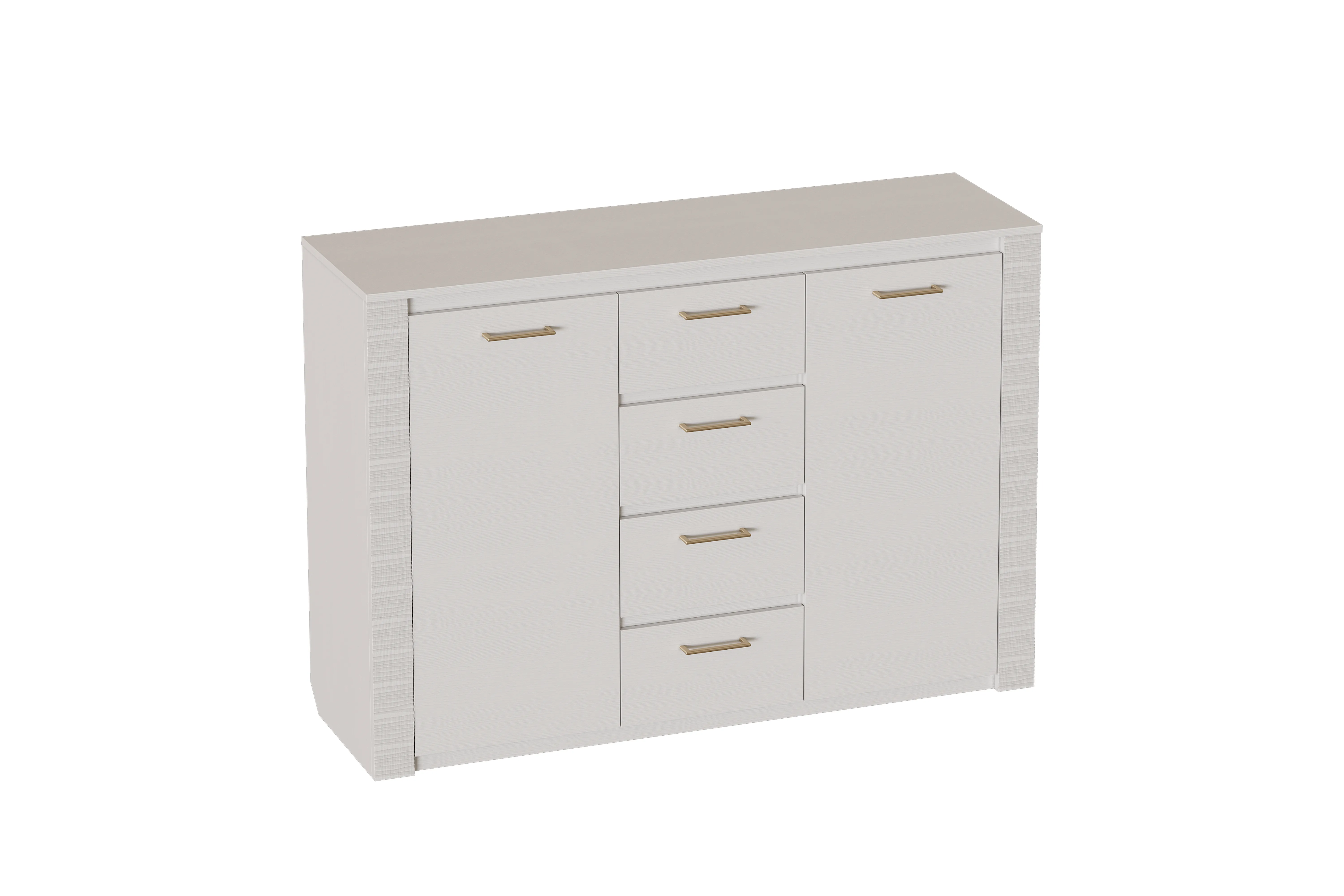 Комод оснащен четырьмя выдвижными ящиками на роликовых направляющих и двумя вместительными отделениями за распашными дверцами.