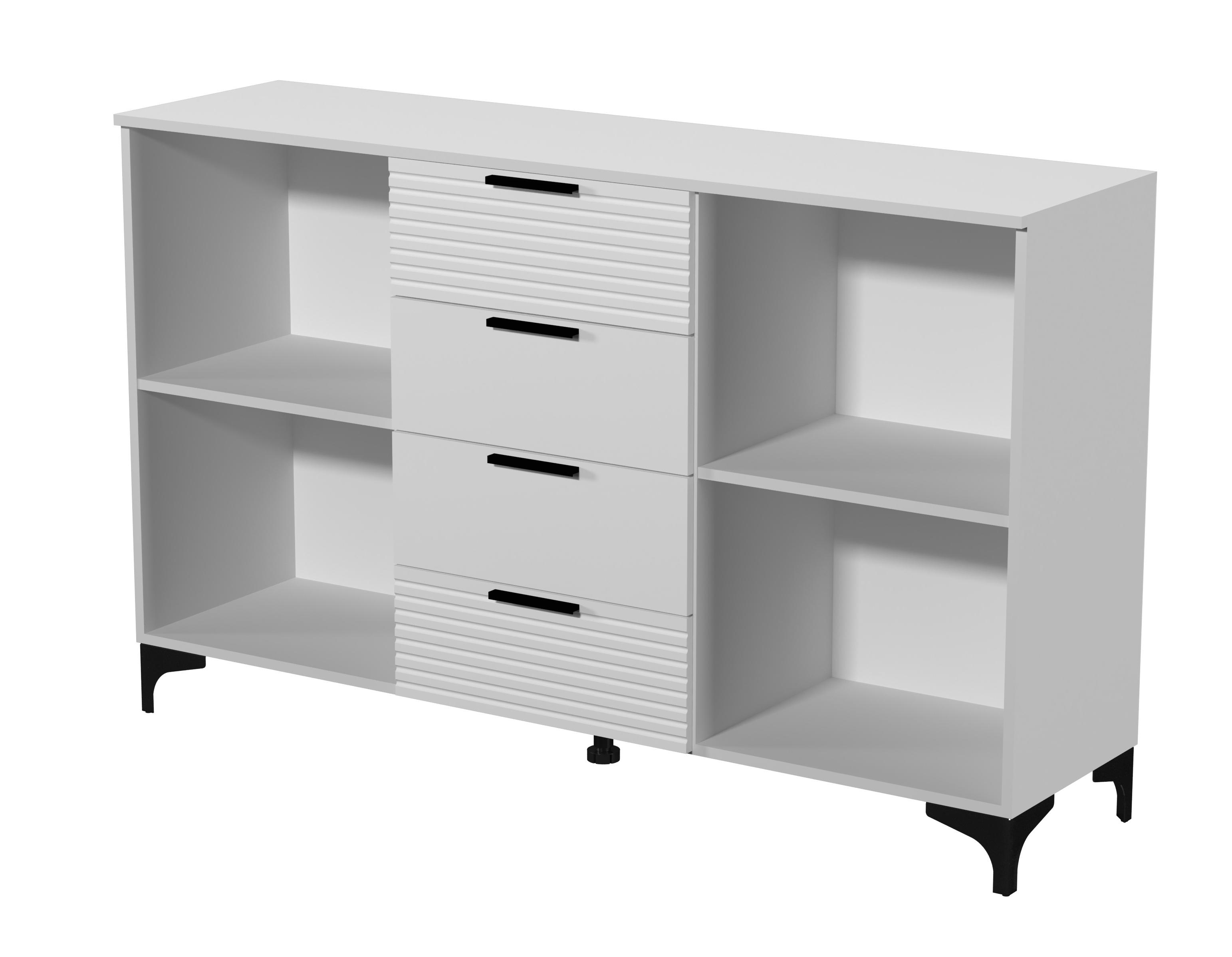 В комоде три секции, слева и справа распашные двери с двумя полками, а по середине четыре ящика на шариковых направляющих полного выдвижения.