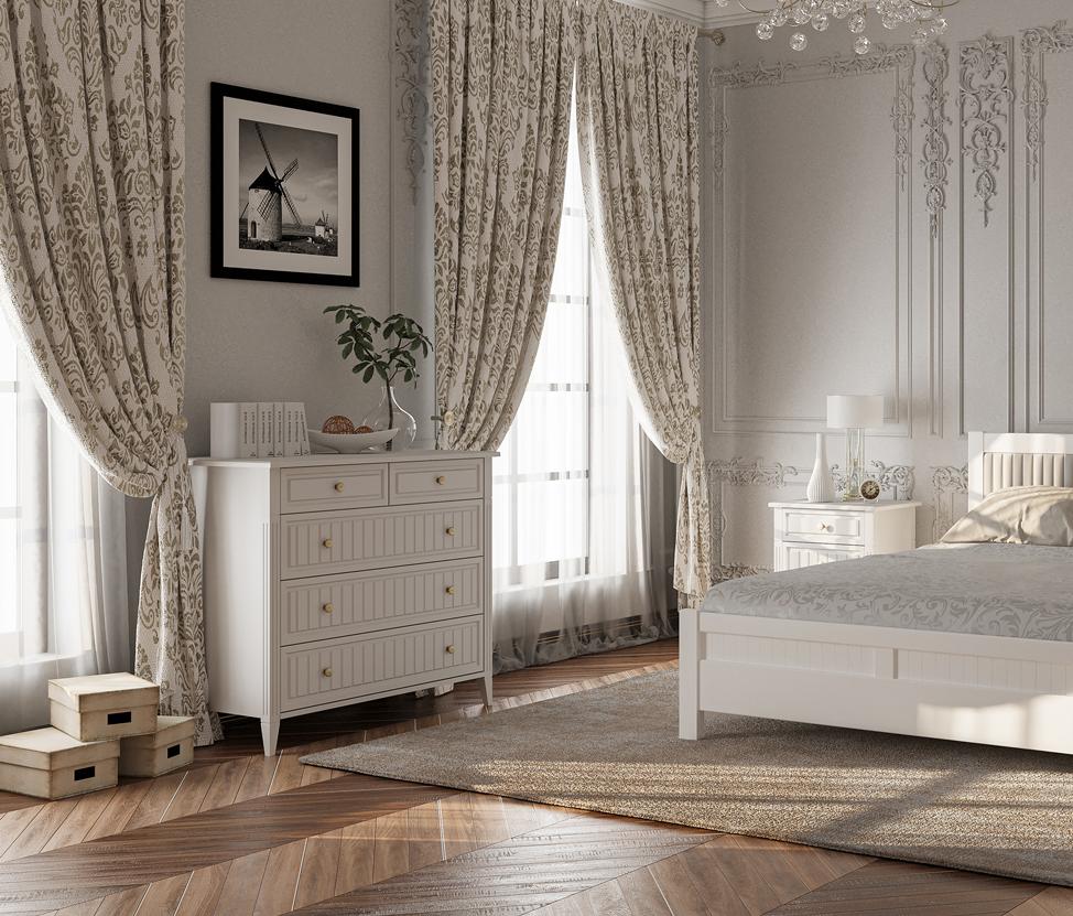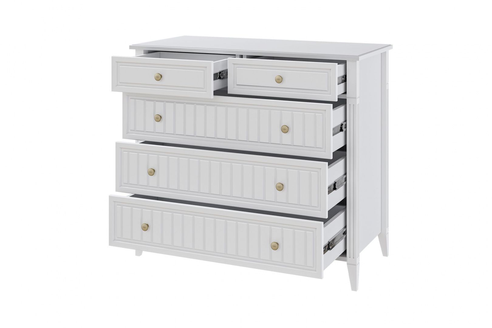 Комод оснащен пятью ящиками, что позволяет организовать хранение вещей максимально удобно и эффективно. Комод с шариковыми направляющими полного выдвижения, что обеспечивает плавное и бесшумное открывание и закрывание ящиков.