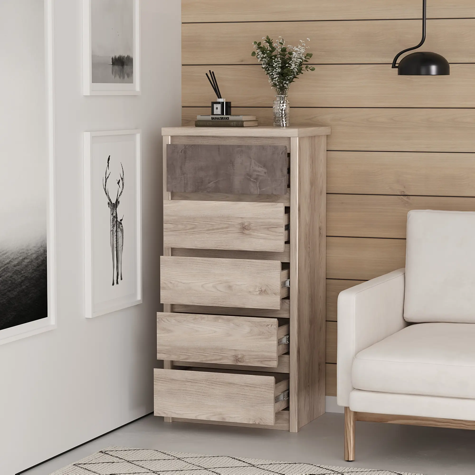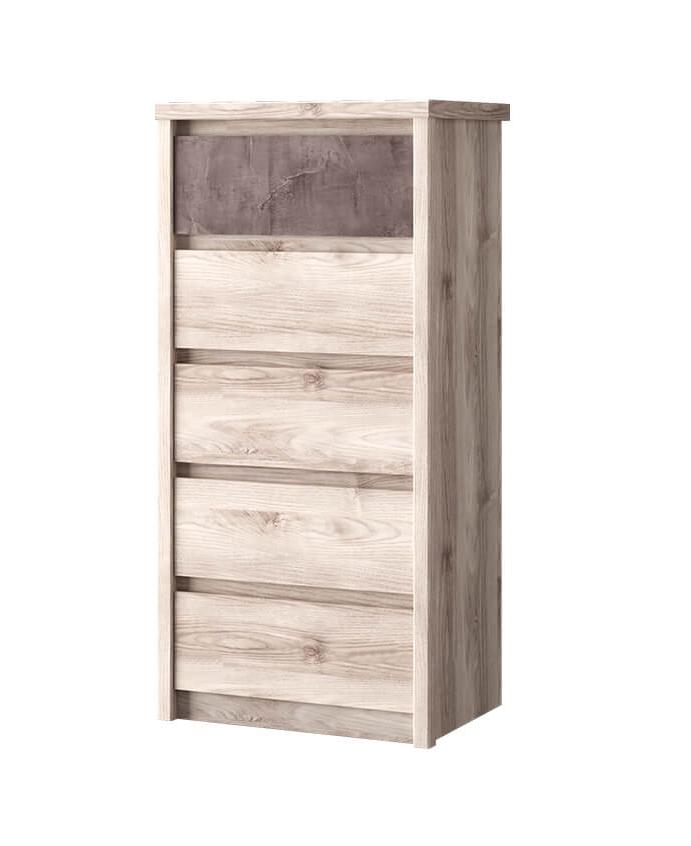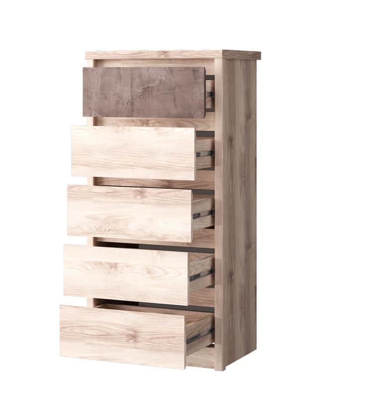 Комод JAZZ 5S/56 создан в заводских условиях из ЛДСП, его торцы отделаны кромочным материалом, а в ящиках установлены шариковые направляющие европейского производства. Такая фурнитура обеспечивает основным элементам плавный ход без рывков и заклинивания. Комод «Джаз» поможет хранить мелкие вещи, аксессуары для новорожденного и прочие бытовые мелочи.
