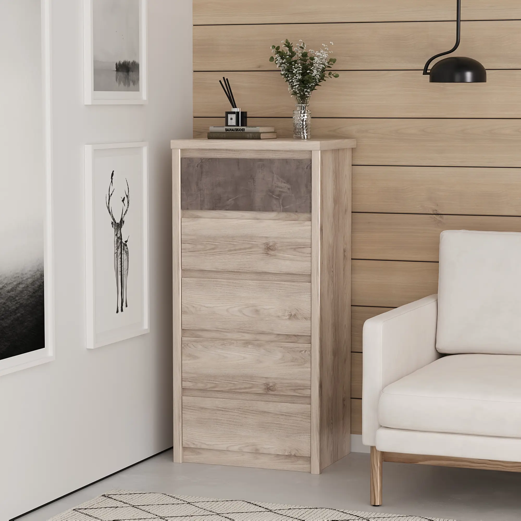 По всей поверхности напольного комода JAZZ 5S/56 проходит красивая фактура дерева, оттененная цветом каштана найроби и оникса. Коричнево-серая цветовая гамма смотрится благородно и стильно в любом интерьере. В этой модели из коллекции «Джаз» присутствуют четкие вертикальные линии и при производстве основное внимание уделено функциональности и удобству. По своему внешнему виду и наполнению она подойдет прихожим, спальням, гостиным и другим жилым комнатам любой площади.