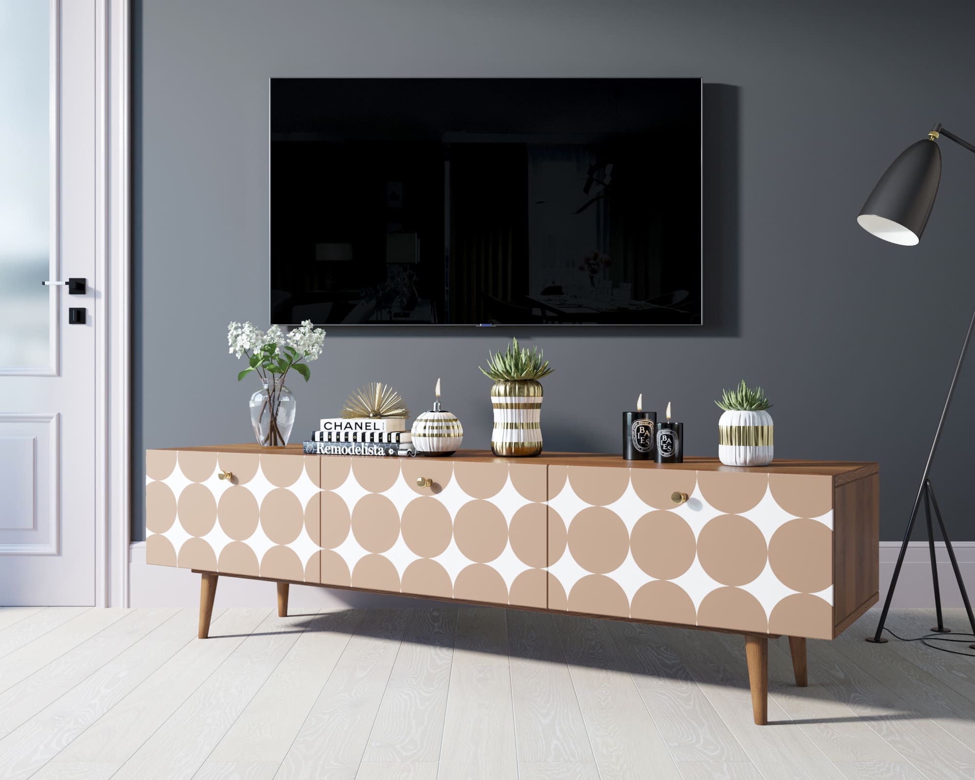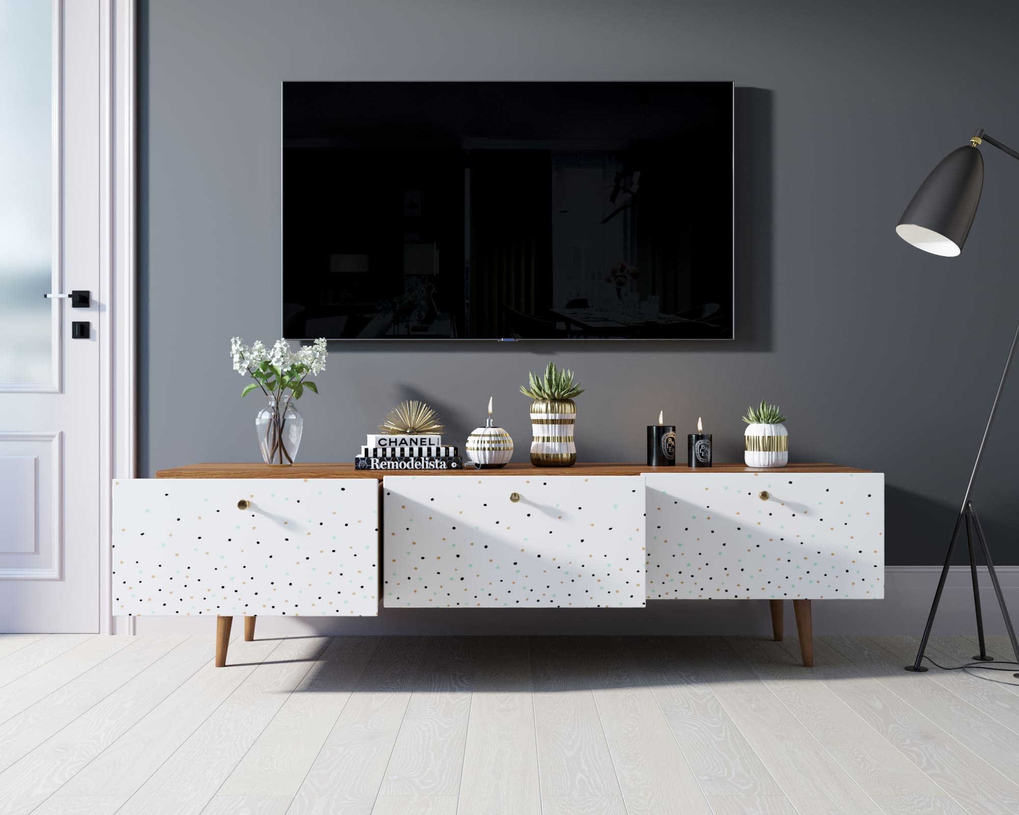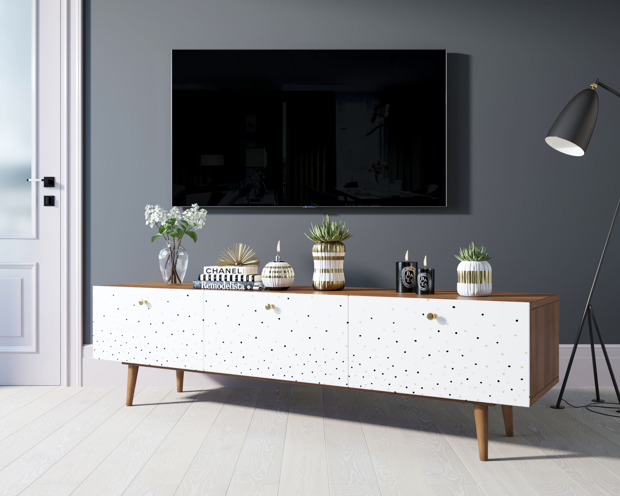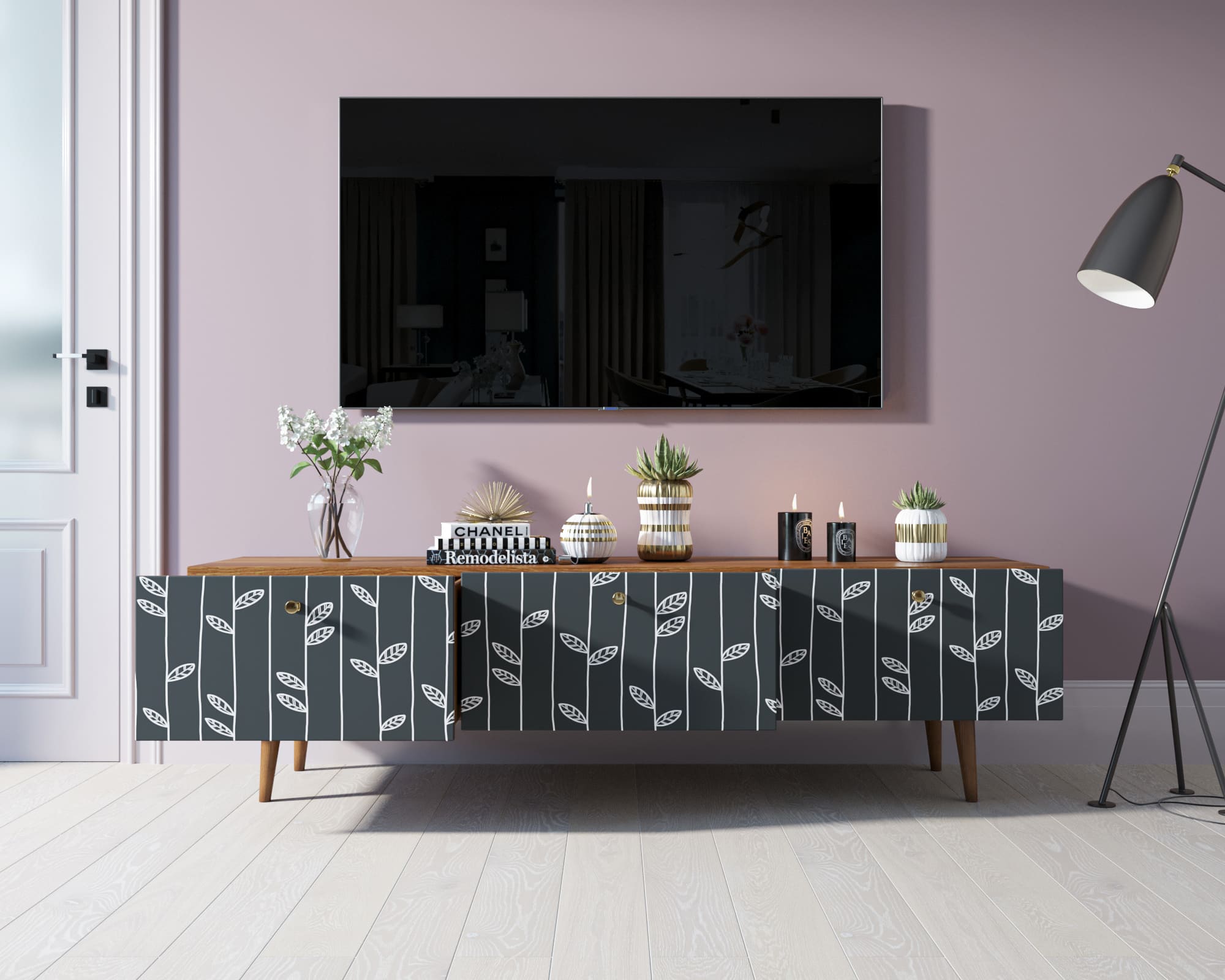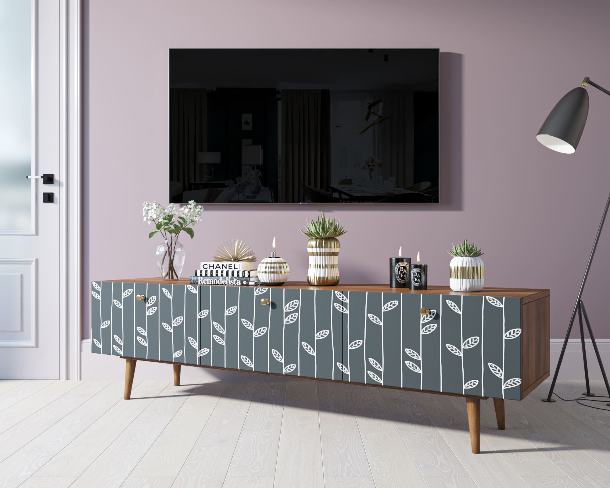Ширина комода 180 см, что позволяет достаточно эстетично смотреться с широкоформатными телевизорами.