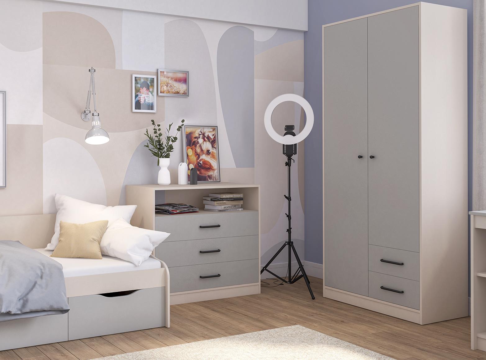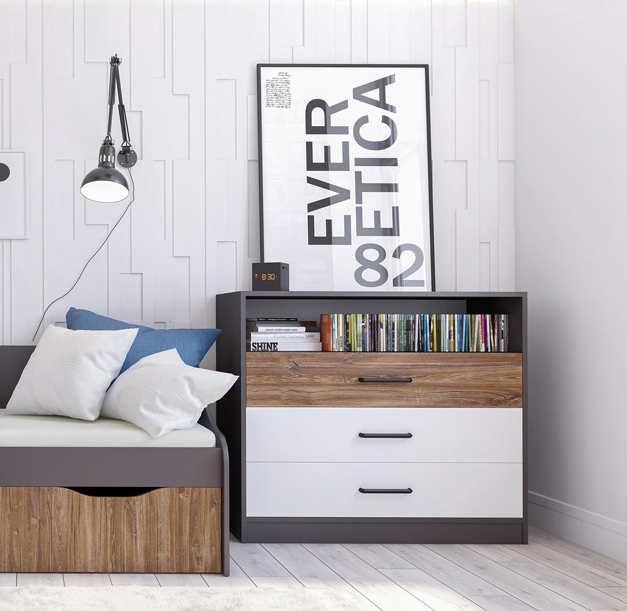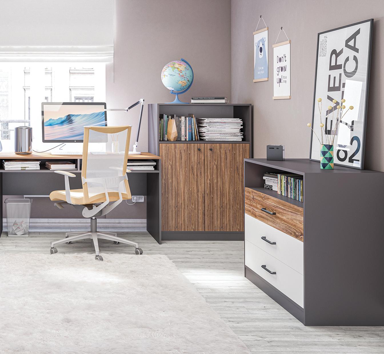 Цветовая палитра коллекции Мальма: белый, графит, Дуб Стирлинг. Спокойные оттенки мебели станут прекрасным фоном для ярких аксессуаров и вещей, помогут избежать лишнего визуального шума в интерьере.