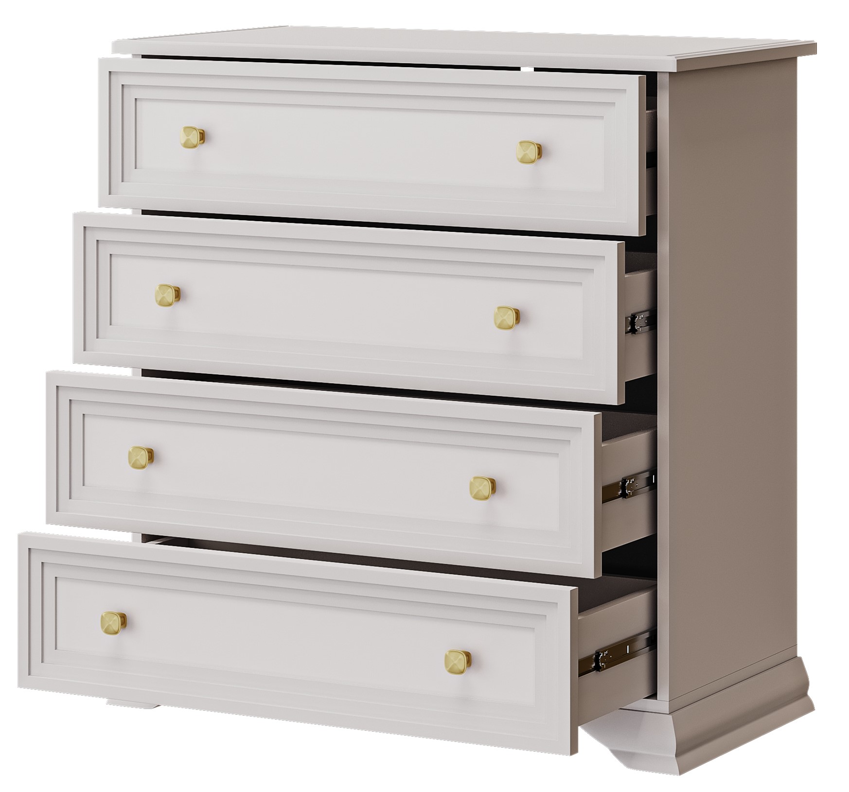 Все ящики оснащены шариковыми направляющими полного выдвижения, что гарантирует плавное и бесшумное открывание. Лицевая фурнитура из металла в цвете брашированное золото добавляет изделию роскошного вида. Рамочный профиль на фасаде придаёт комоду аккуратность и завершённость, делая его гармоничной частью коллекции «Орландо».