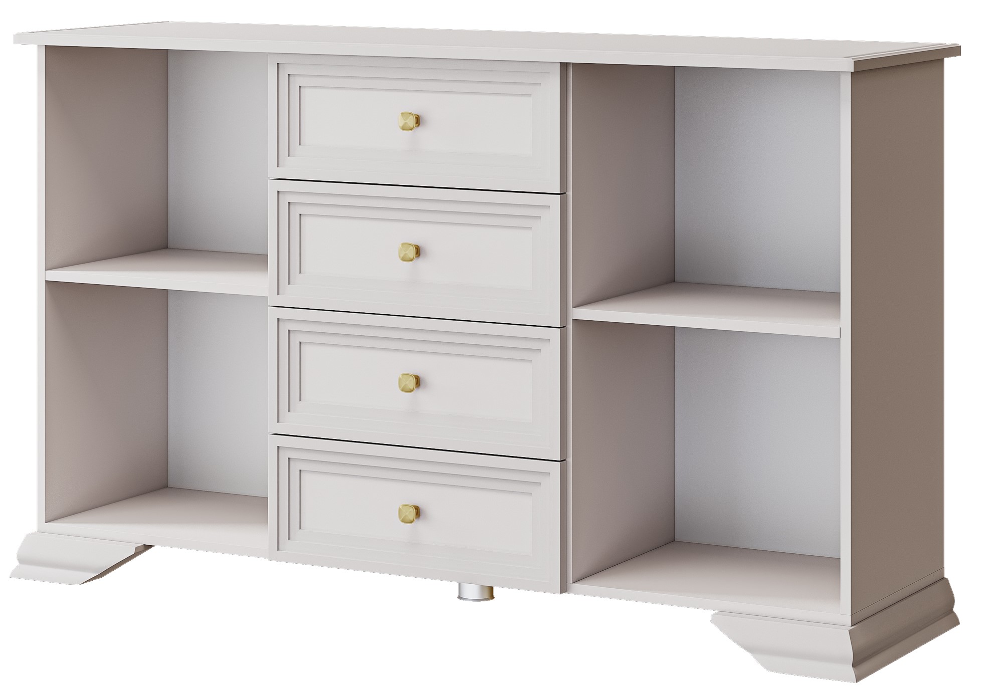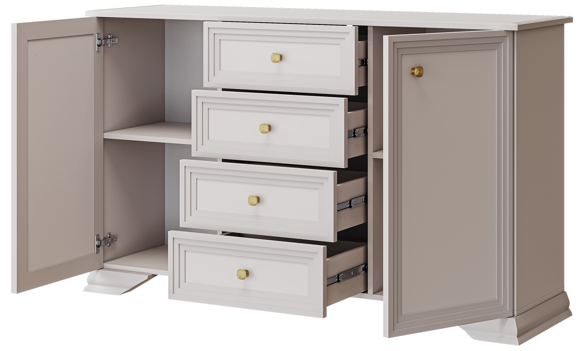 Дверцы комода установлены на петли с доводчиком, что гарантирует плавное и аккуратное закрывание. Четыре ящика оснащены шариковыми направляющими полного выдвижения, обеспечивая удобство и бесшумность использования.