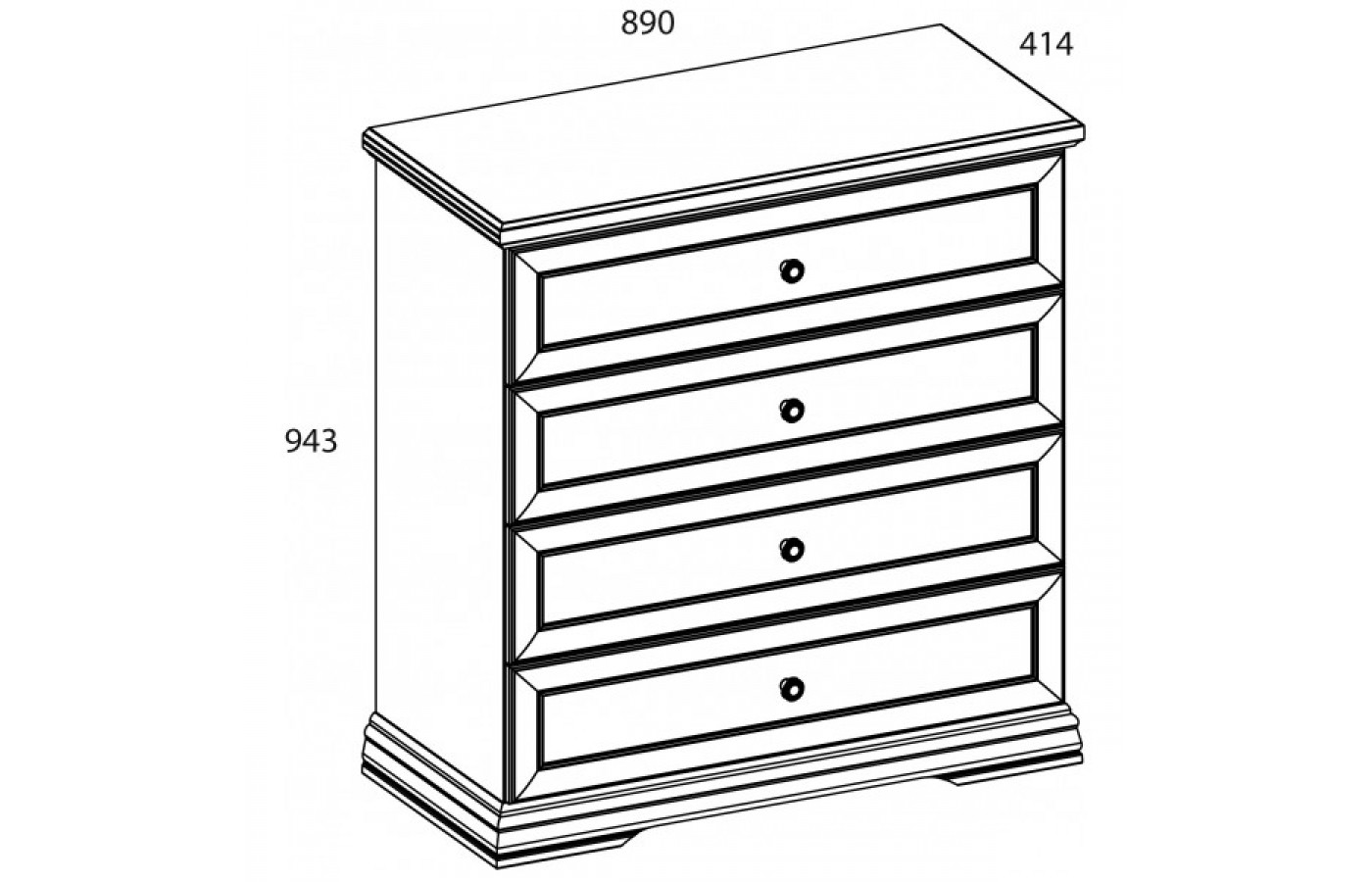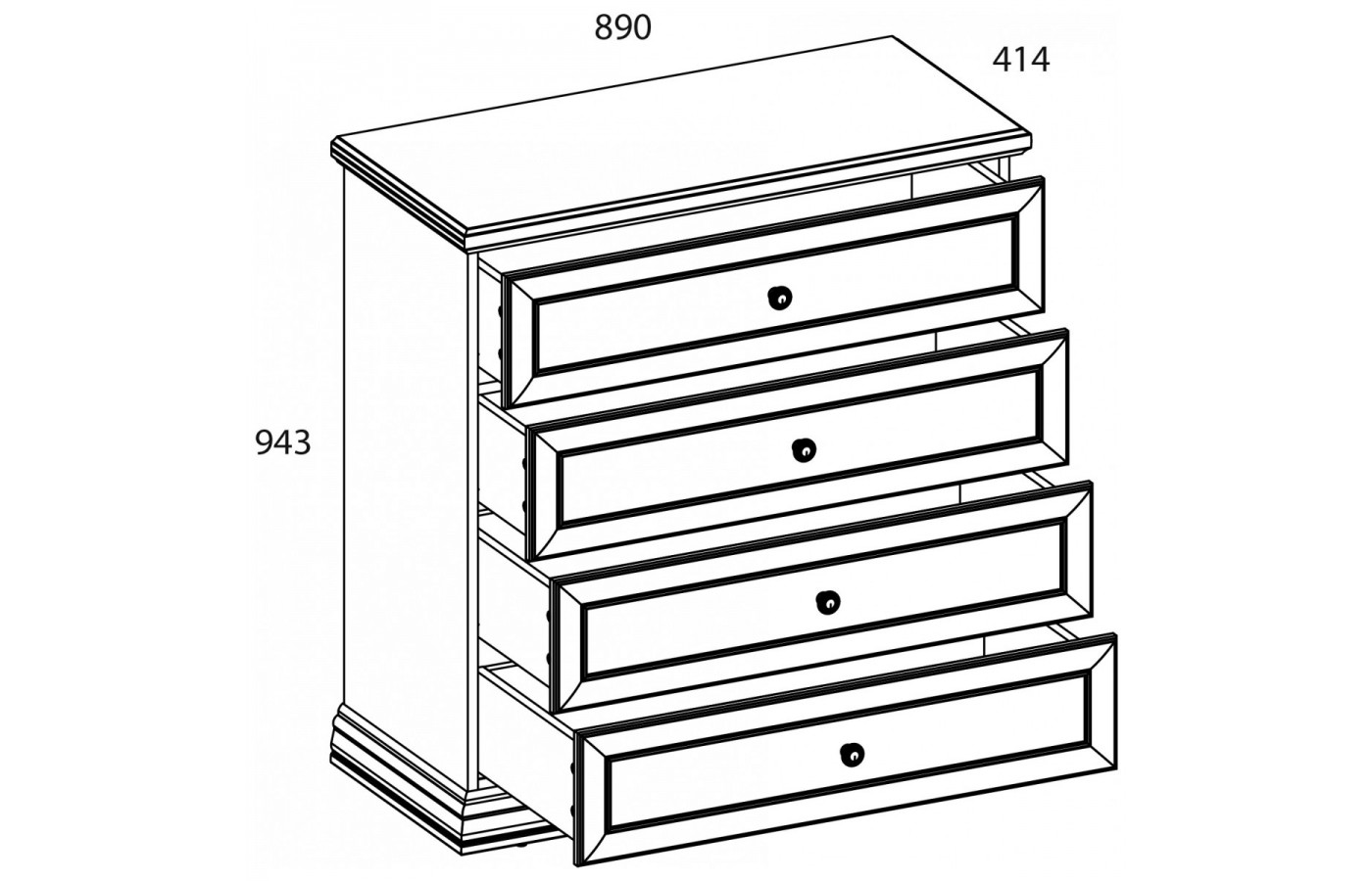 Конструкция комода 4S прямая, представляет четыре выдвижных ящика, расположенных друг над другом.