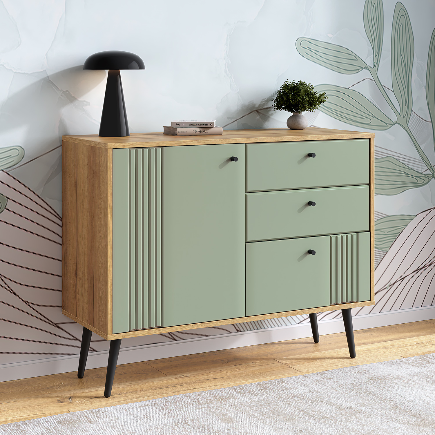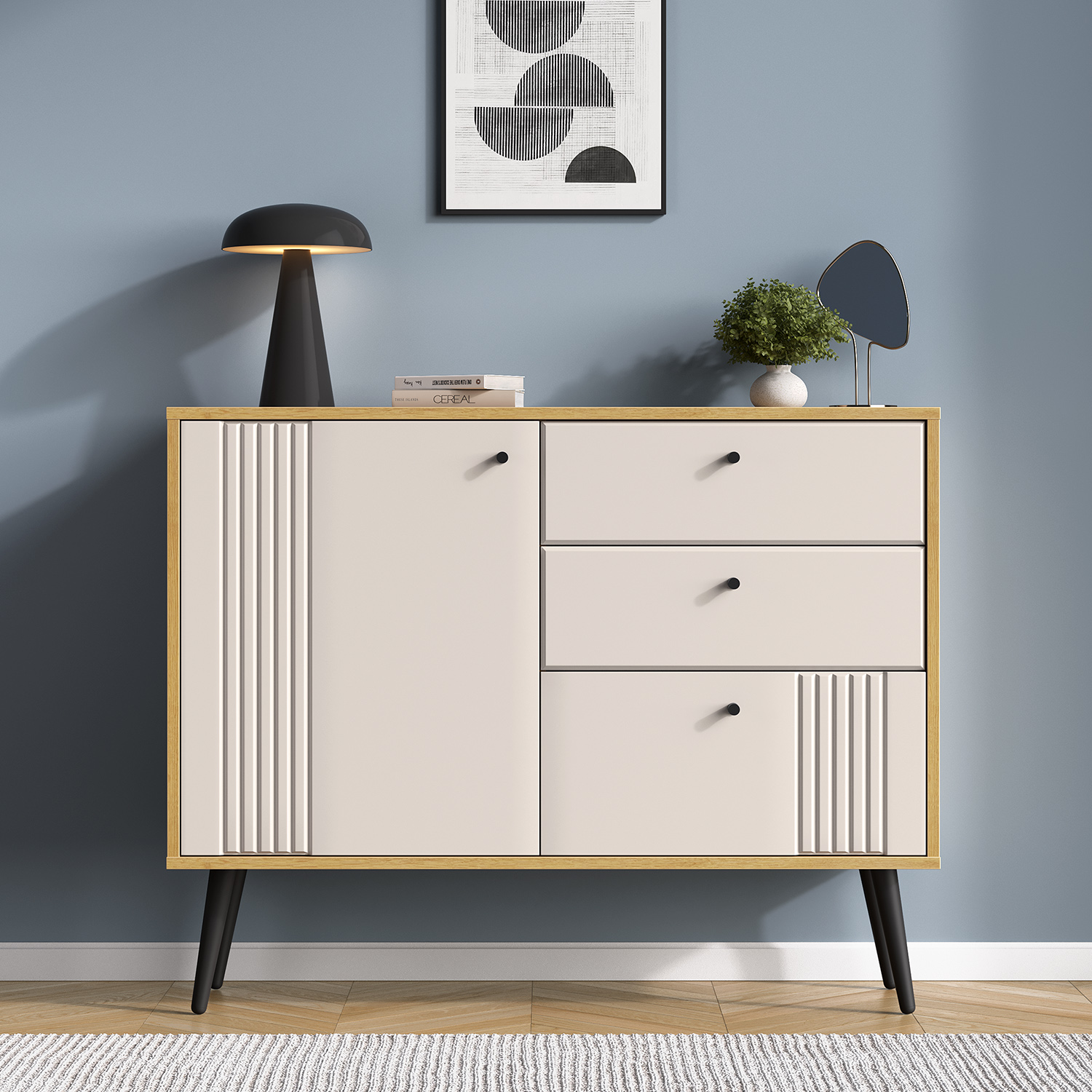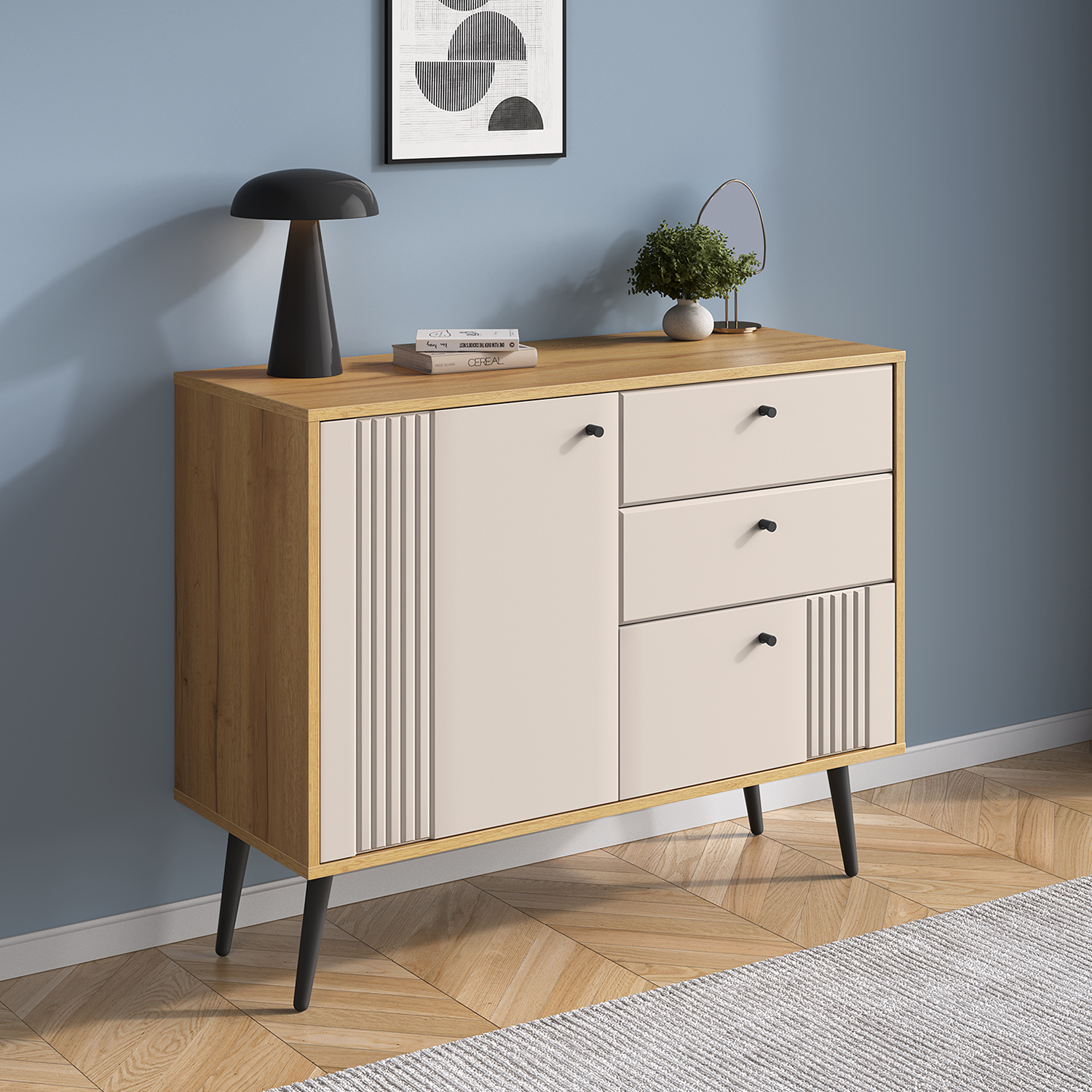 Этот комод станет универсальным решением для спальни, гостиной или прихожей: он органично впишется в современный или скандинавский интерьер, привнося в него нотки теплоты и сдержанной элегантности.