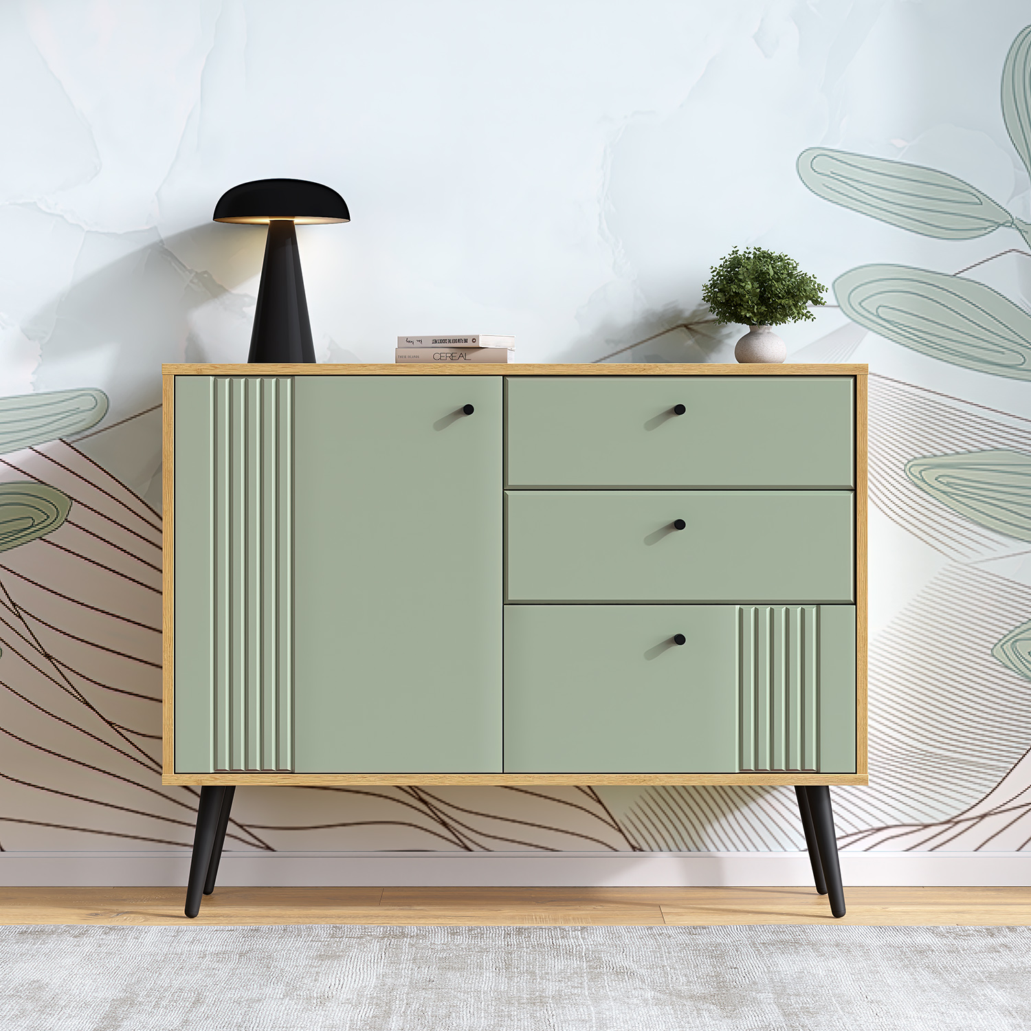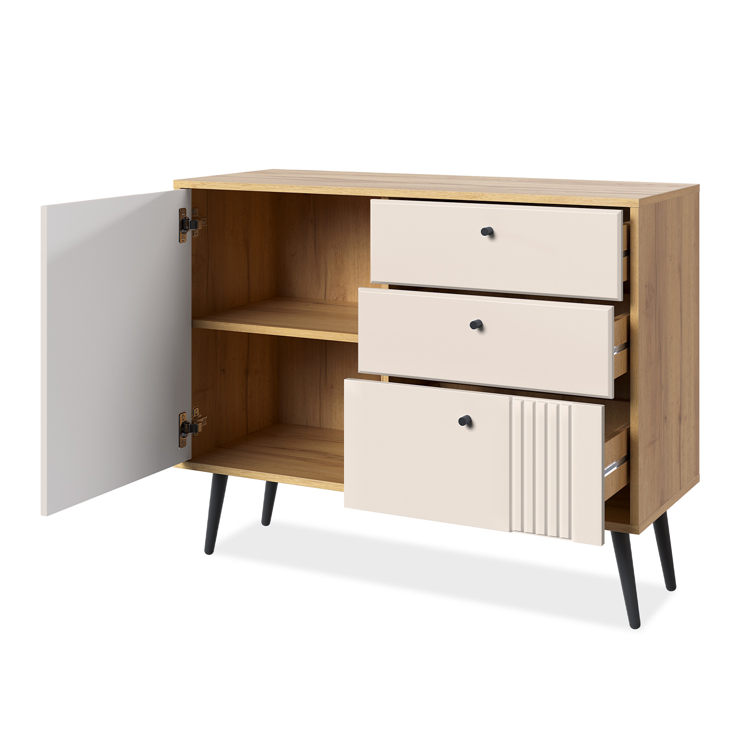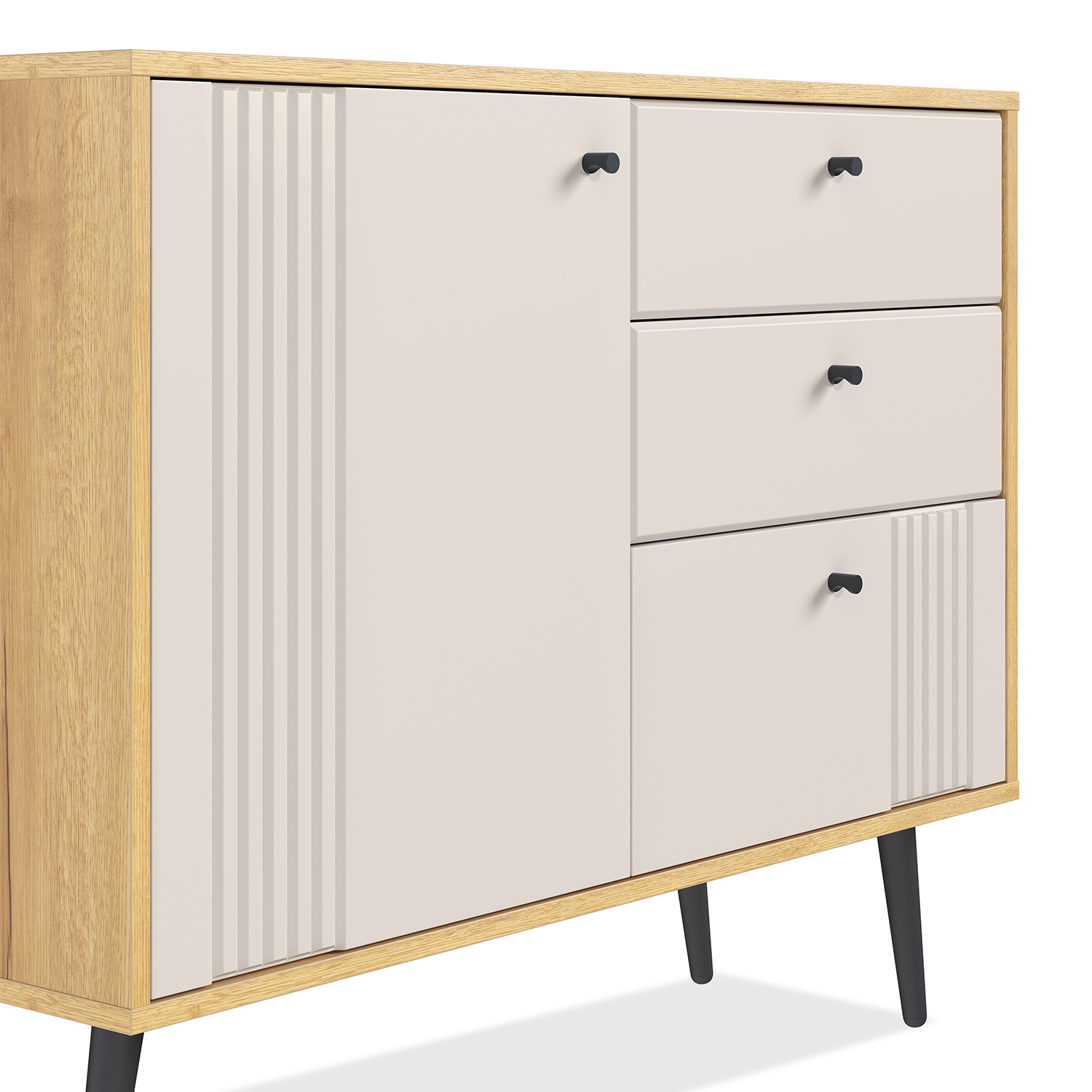 Этот комод станет универсальным решением для спальни, гостиной или прихожей: он органично впишется в современный или скандинавский интерьер, привнося в него нотки теплоты и сдержанной элегантности.