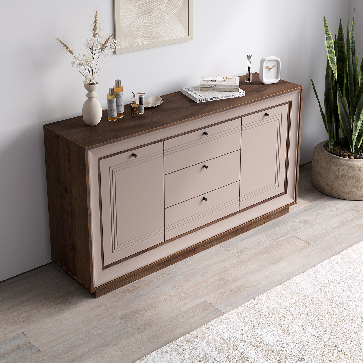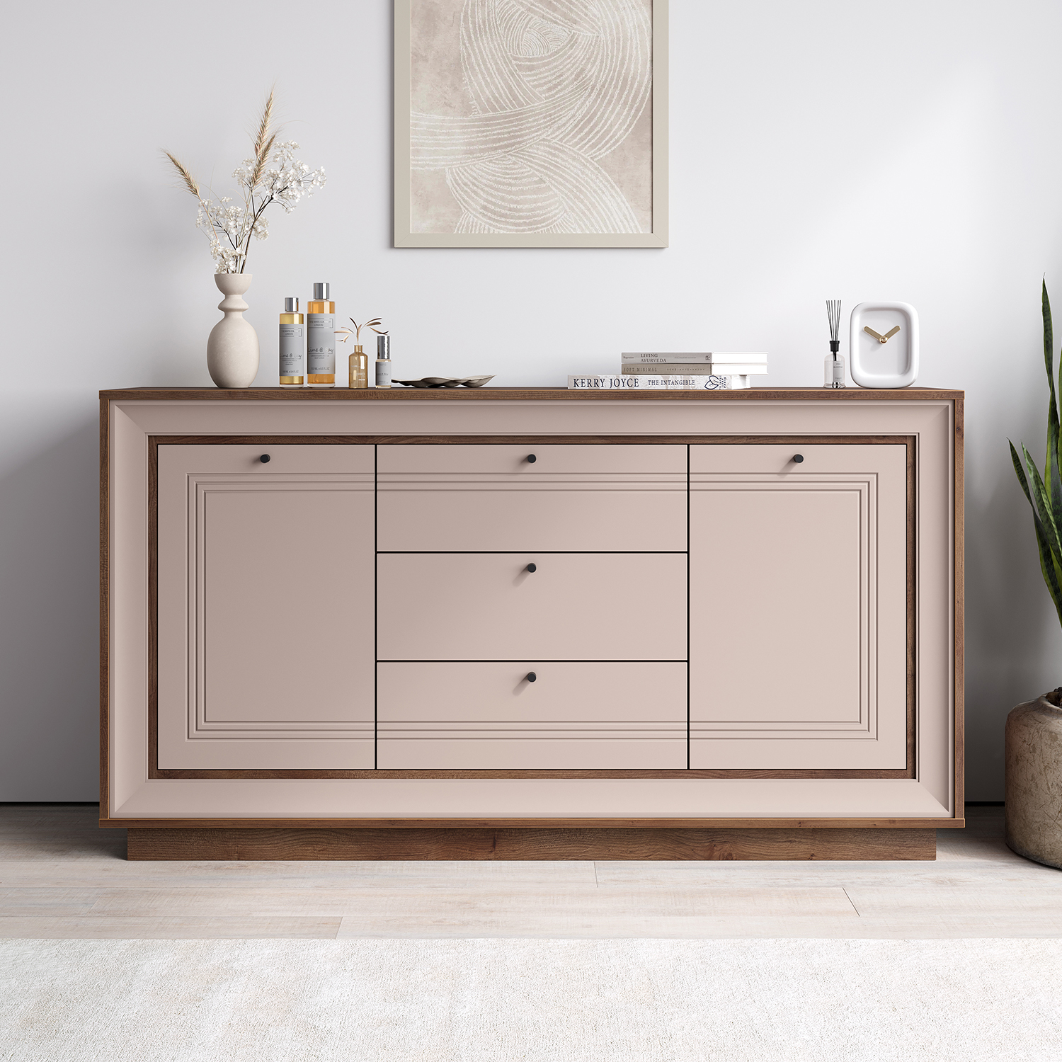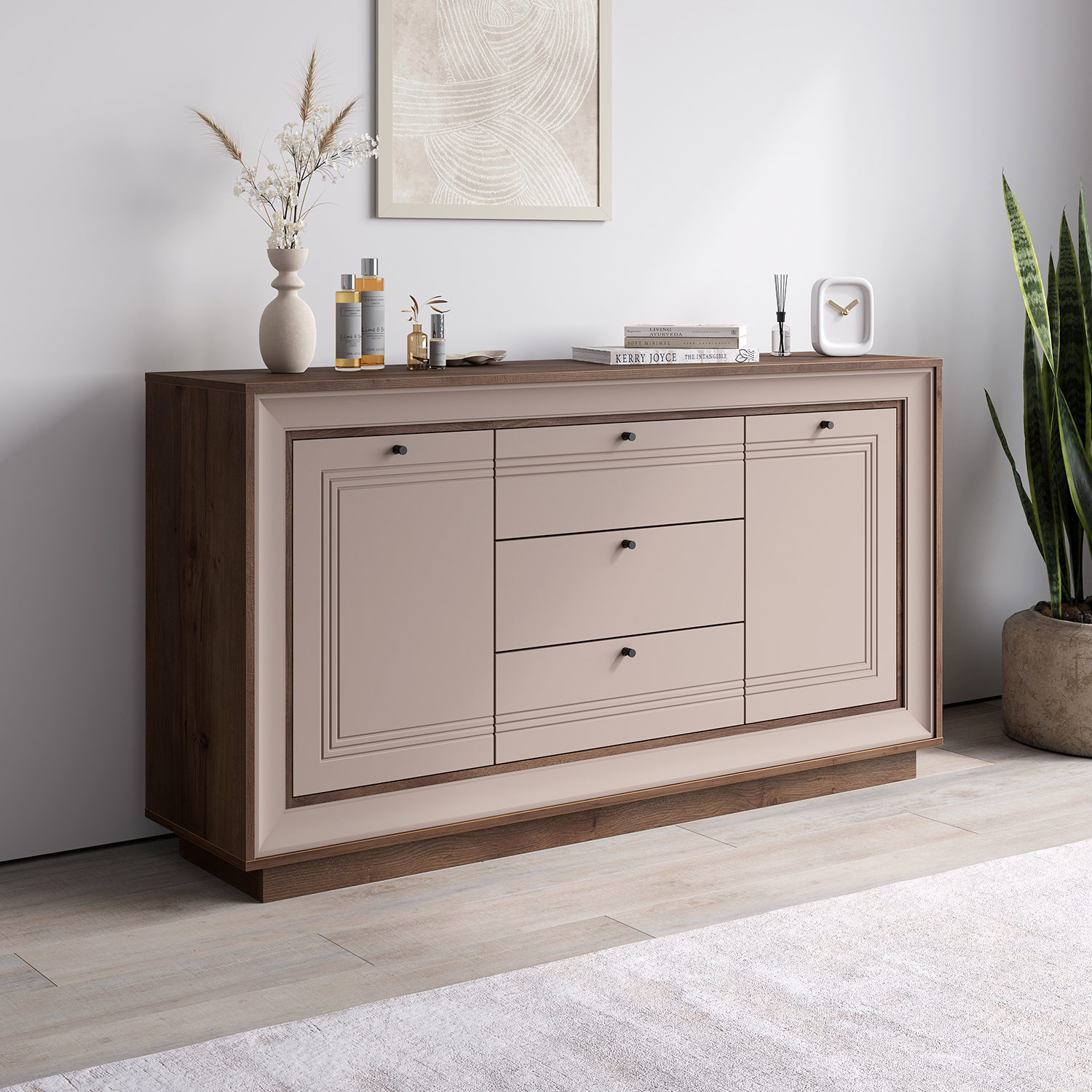 Три вместительных выдвижных ящика и два отделения за дверцами обеспечивают продуманную систему хранения: можно удобно разместить бельё, аксессуары и предметы быта, сохранив порядок в пространстве. Компактная, но вместительная конфигурация делает комод удачным решением для спальни, гостиной или прихожей.