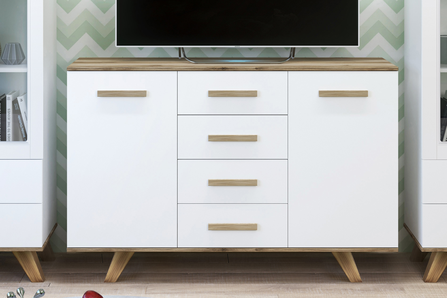 Комод выполнен в универсальном дизайне, который органично впишется в спальню, гостиную или молодёжную комнату. А благодаря сочетанию функций комода и ТВ‑тумбы вы получаете два предмета мебели в одном — практично и экономично.