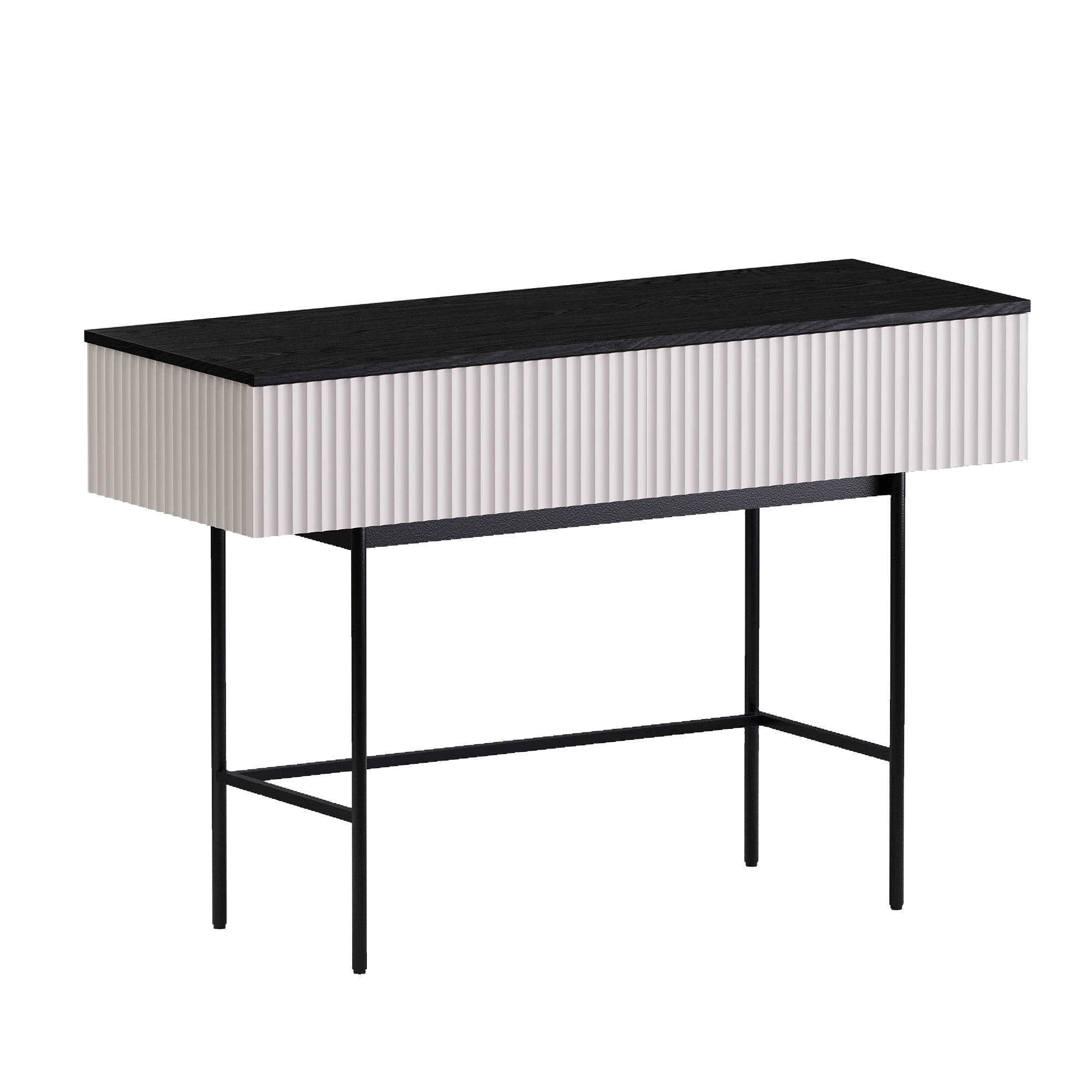 Стол консольный Mikko установлен на высокое металлическое основание черного цвета, стойки которого выполнены из круглой трубы d 20 мм, верхний пояс царг аналогичен остальным изделиям, а нижний пояс из квадратной трубы 15*15 мм. В столе два ящика на скрытых направляющих. Скрытые направляющие INNER Push-open (нажал-открыл) - МакМарт. Дно ящиков – ДВПО 3,2 мм. Основание металлическое, окрашено черной эмалью, высотой 600 мм, с пластиковыми регулируемыми подпятниками. Стол консольный рекомендуется крепить к стене для защиты от опрокидывания (крепежи входят в комплект).
