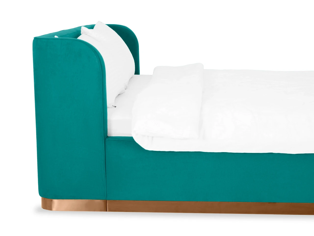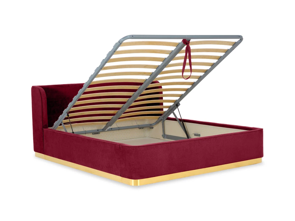 Кровать оснащена металлическим подъемным основанием с гибкими ламелями, под которым находится внутреннее отделение, предназначенное для хранения белья или других предметов. Спинка и царги кровати выполнены из плиты ЛДСтП т.22мм, брусков и березовой фанеры. Настилы из пенополиуретана и синтепона. Подиум сделан из плиты МДФ и брусков. Нижнюю часть подиума украшает металлическая лента из нержавеющей стали с покрытием «матовое золото». Дно бельевого ящика: плита ЛДСтП т.16мм «Белая Гладкая».