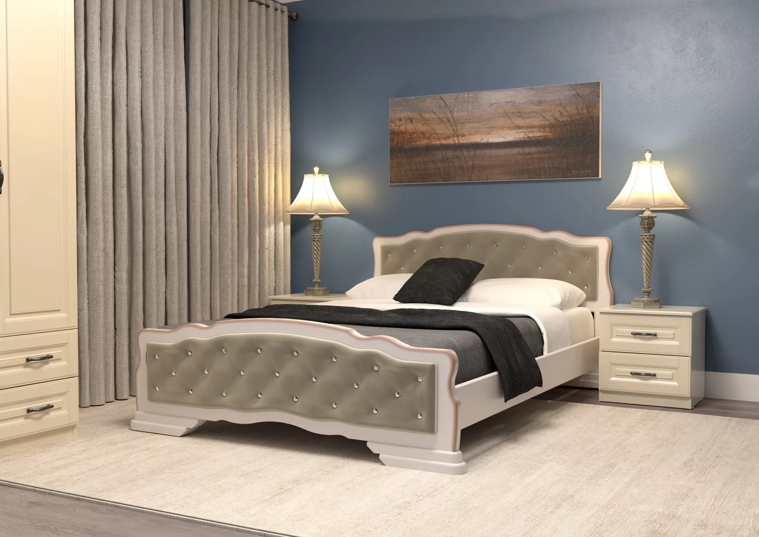 В центре изголовья и изножья имеются мягкие вставки. Они изготовлены из МДФ, покрыты мягким поролоном и обшиты тканью. Вставки декорированы в центре стразами и жгутом по периметру.
