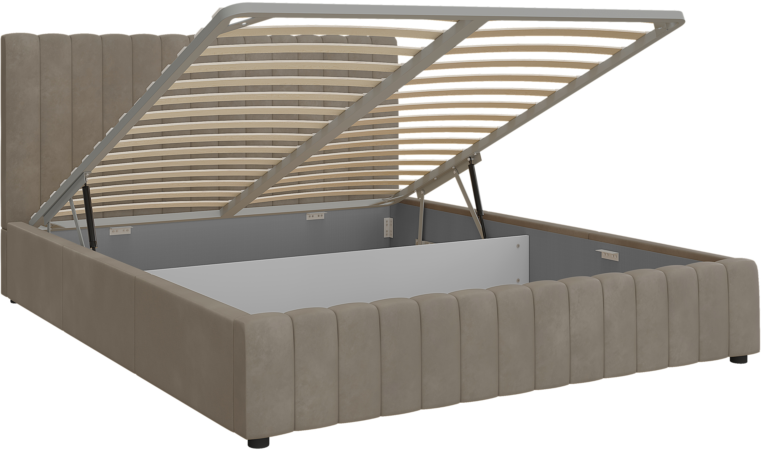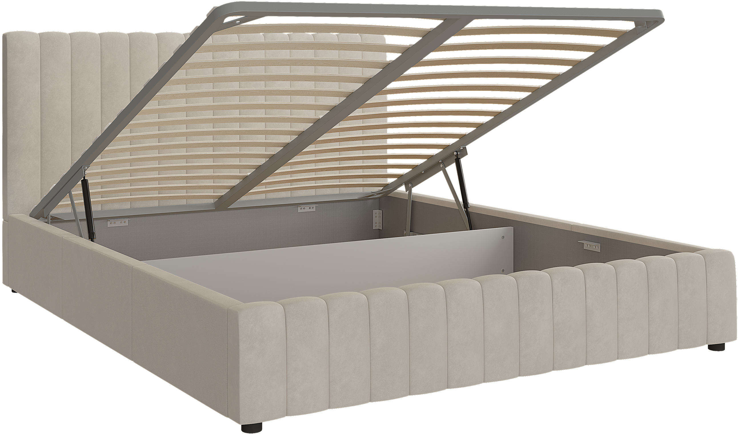 Кровать комплектуется прочным металлокаркасом и может быть дополнена подъемным механизмом с газовым амортизатором для удобного хранения.