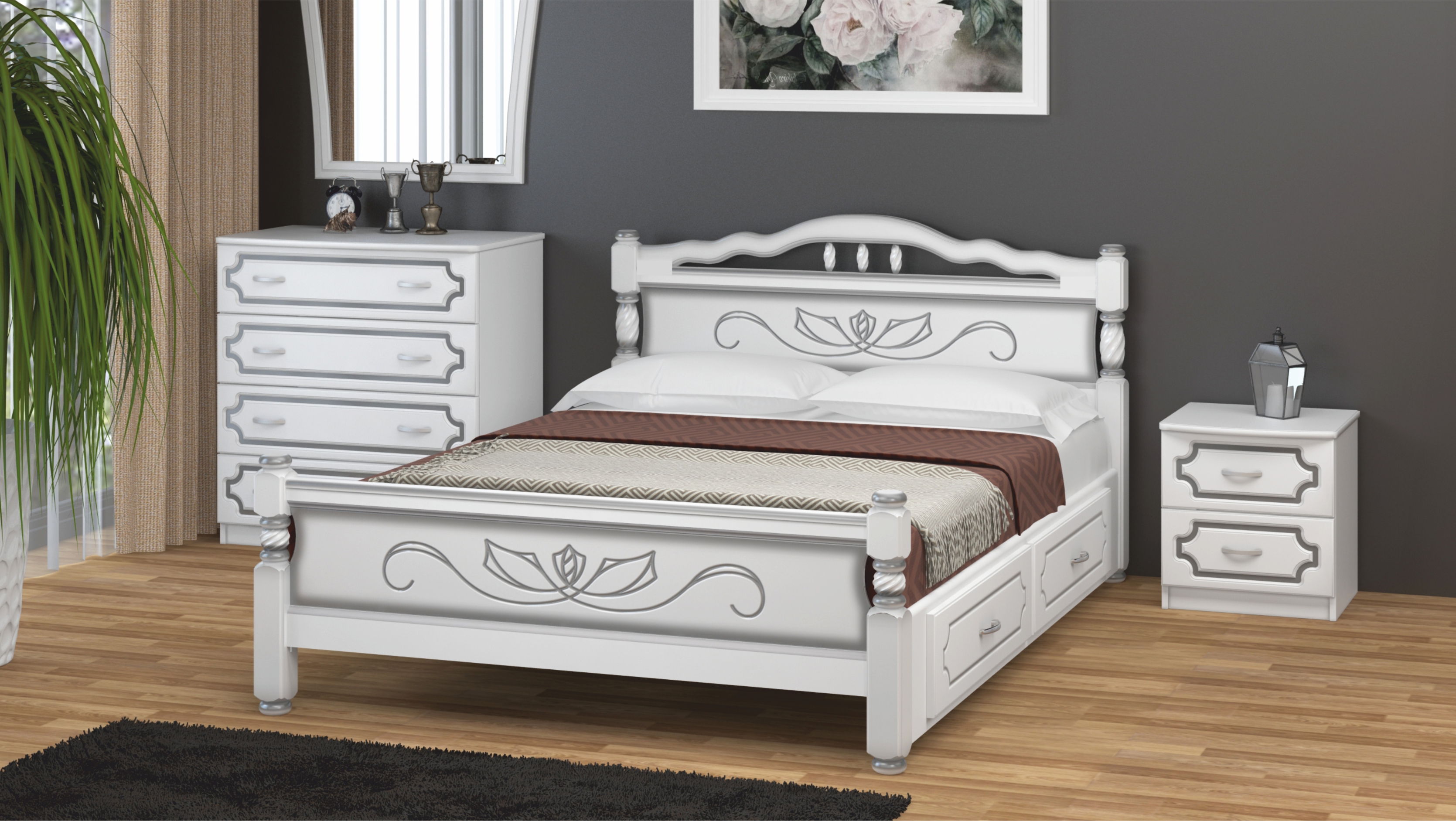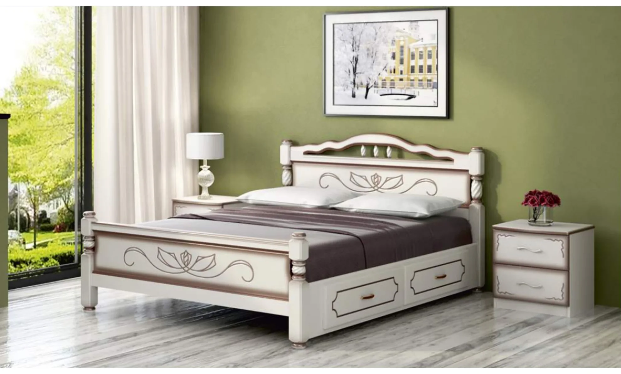 Каркасы головной и ножной спинки изготовлены из массива сосны и покрашены эмалью. В центре изголовья и изножья имеются вставки с узором. Вставки изготовлены из МДФ.