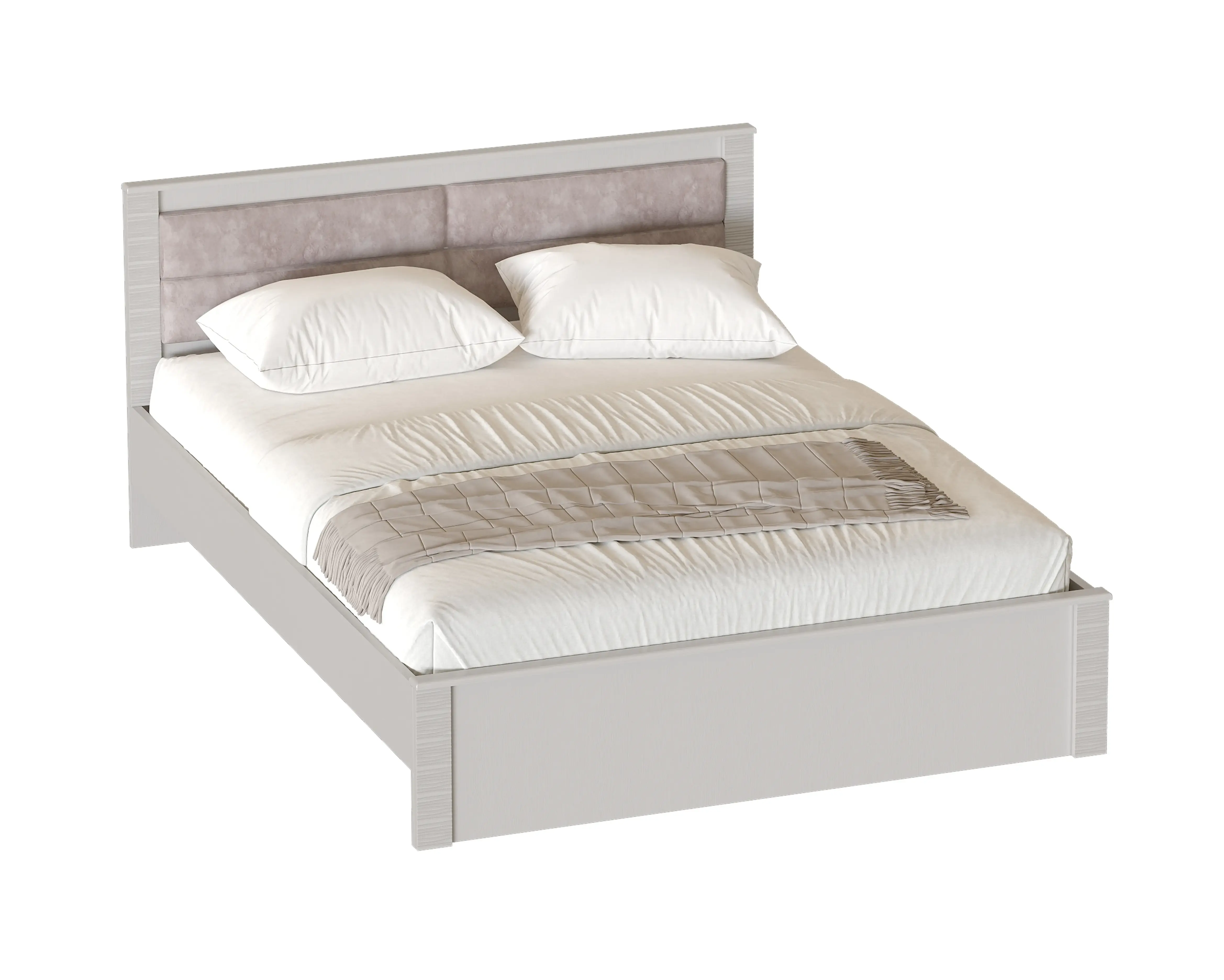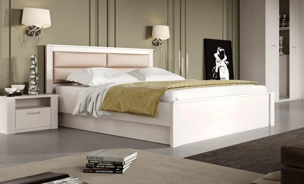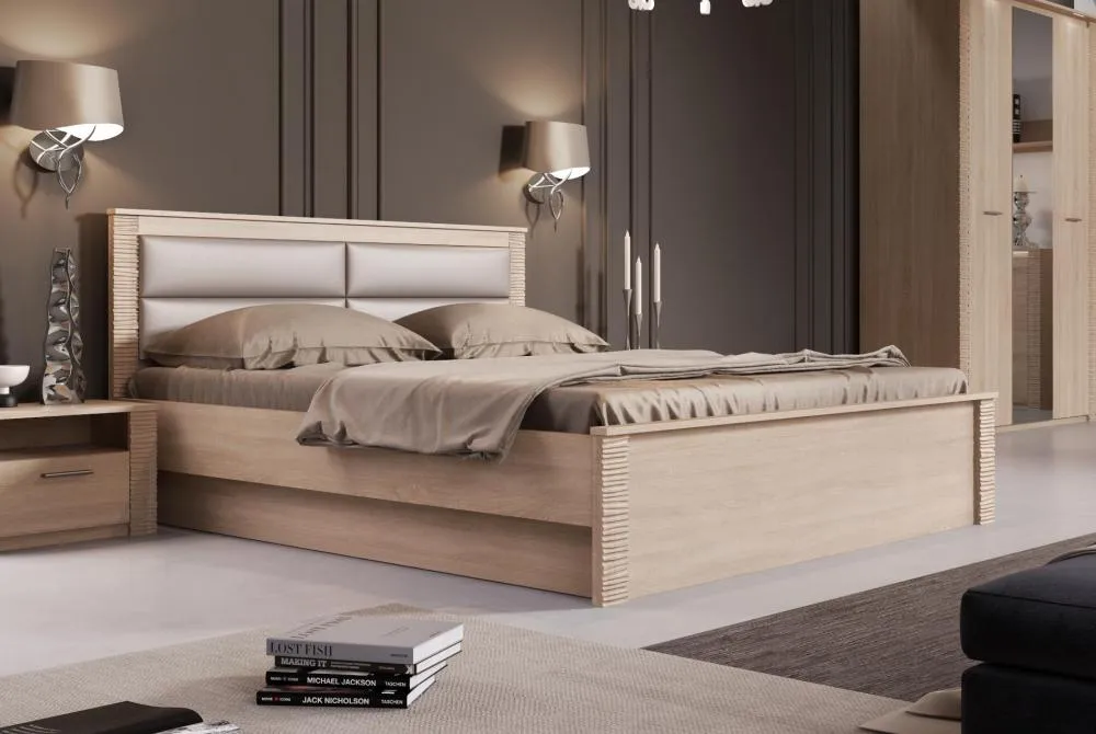 Кровать оснащена мягким изголовьем, состоящим из четырёх элементов, обтянутых экокожей.