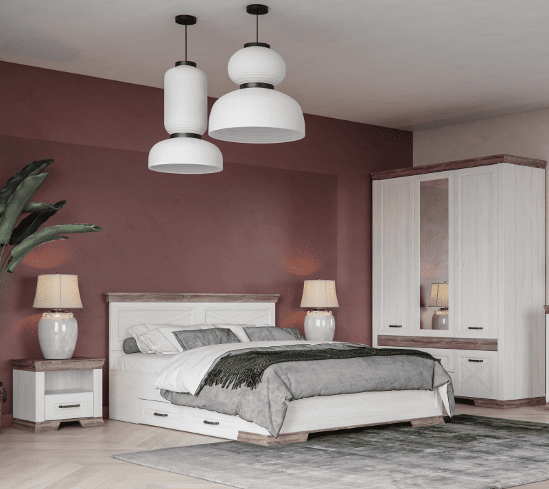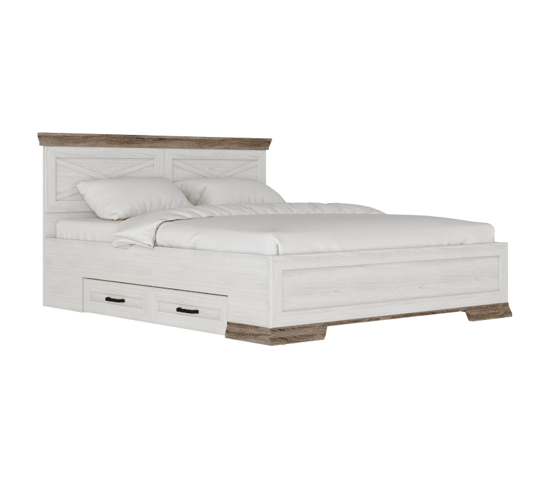 Кровать оснащена выкатанными ящиками, что позволяет хранить в них постельное белье, подушки или одеяла. Эта деталь значительно экономит место в пространстве.