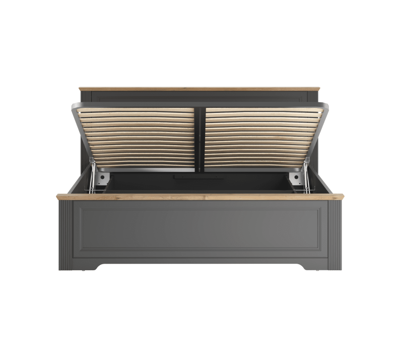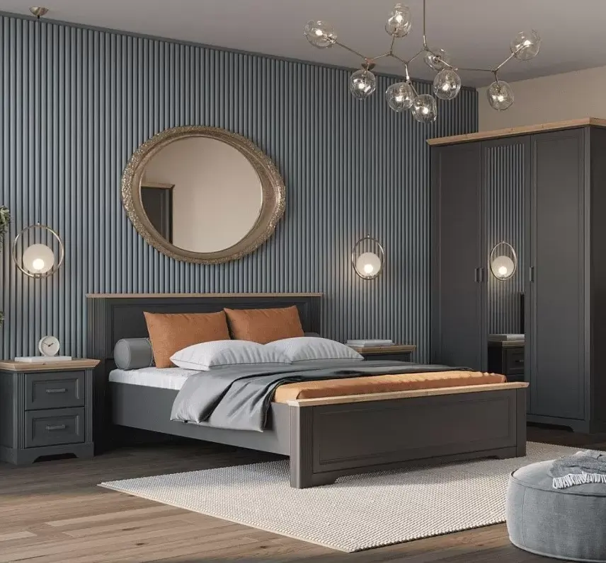 Графитовый каркас кровати с декоративной отделкой под дуб артизан придаст комнате колоритный вид. Он прекрасно гармонирует с тумбой и шкафом рассматриваемой коллекции и подходит винтажному и неоклассическому стилю. Отличительной особенностью коллекции «Жасмин» являются гофрированные вставки и филенки.