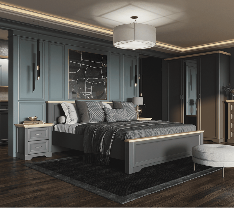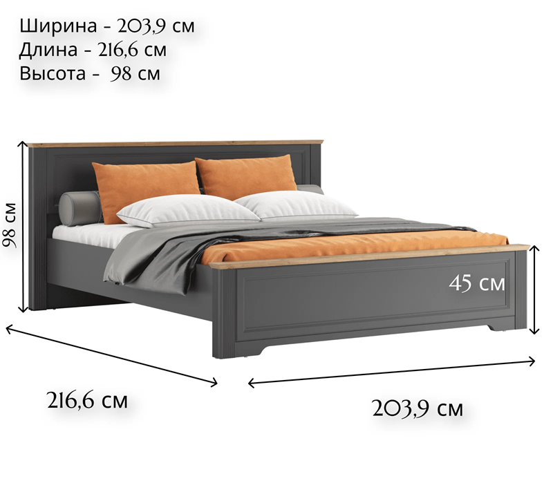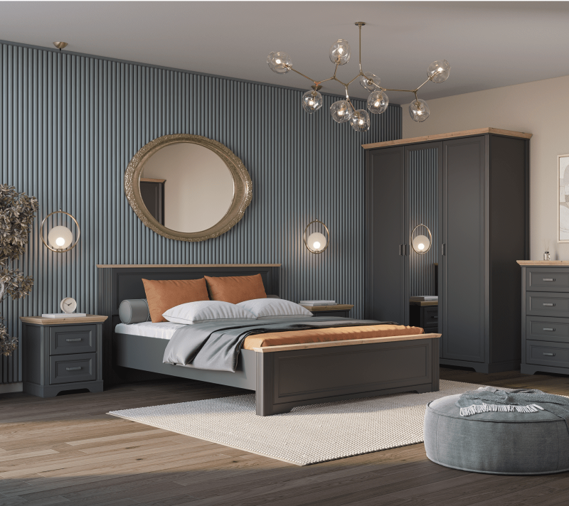 Дизайн кровати Jasmin привлекает необычным сочетанием насыщенного графитового цвета и древесного оттенка под дуб артизан. Настоящим украшением модели являются филенки и декоративные резьбовые планки. Белорусская кровать «Жасмин» гармонично смотрится вместе с прикроватными тумбами из аналогичной коллекции.