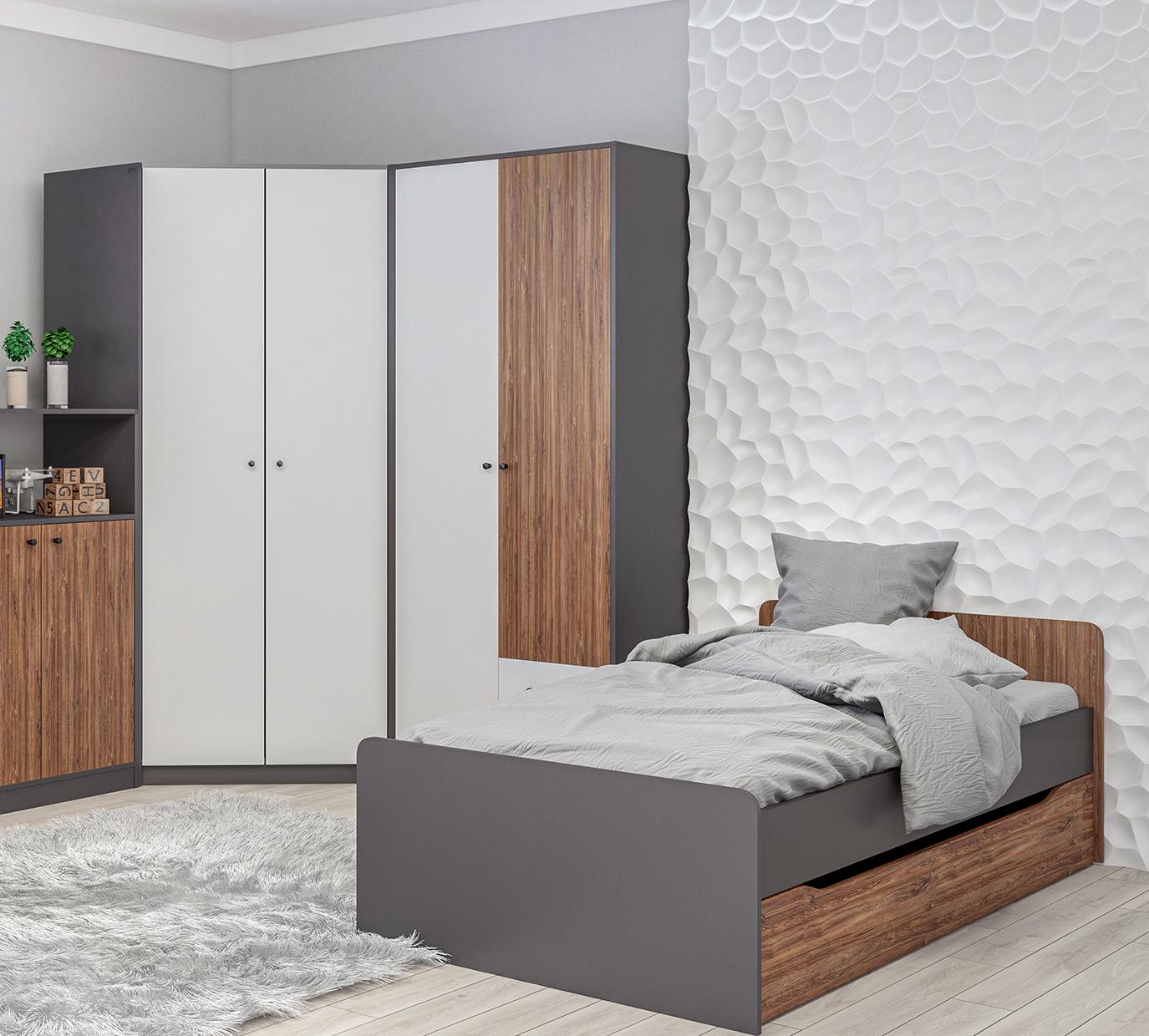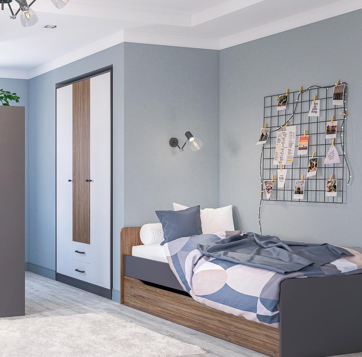 Цветовая палитра коллекции Мальма: белый, графит, Дуб Стирлинг. Спокойные оттенки мебели станут прекрасным фоном для ярких аксессуаров и вещей, помогут избежать лишнего визуального шума в интерьере.