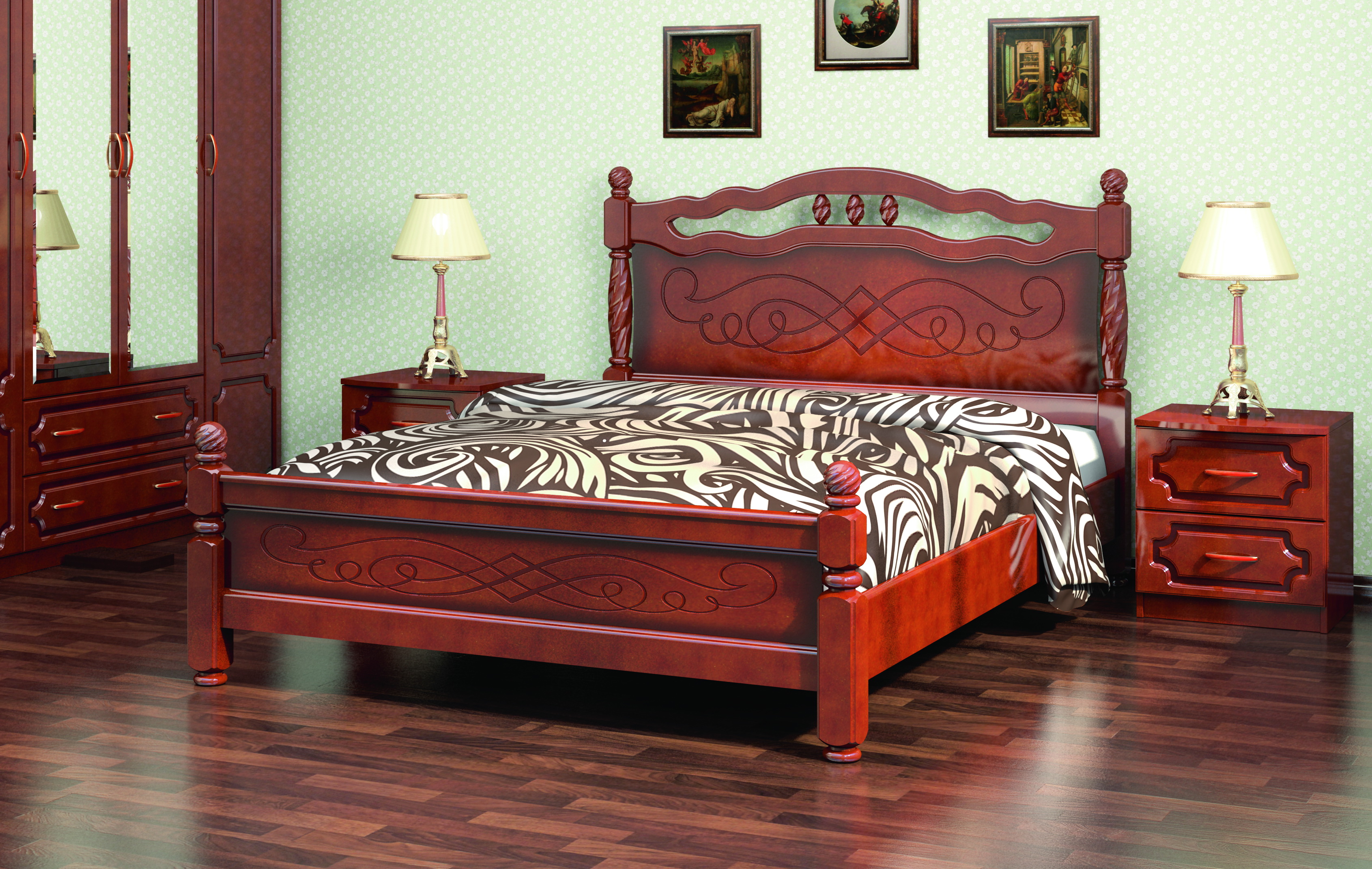 Каркасы головной и ножной спинки изготовлены из массива сосны и покрыты лаком цвета «Орех» с декоративными затемнениями (патиной). В центре изголовья и изножья имеются вставки с узором. Вставки изготовлены из МДФ.