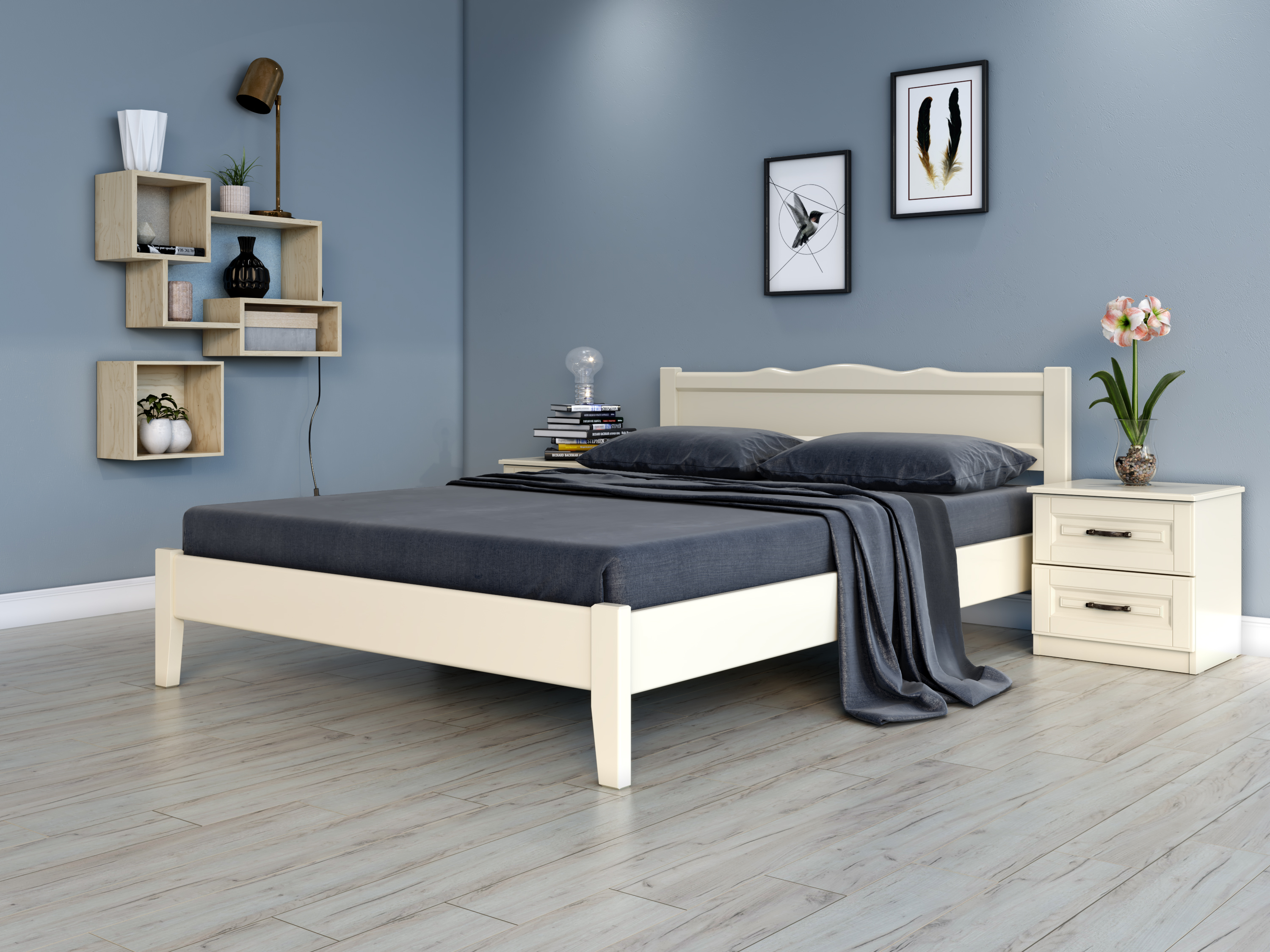 Каркасы головной и ножной спинки изготовлены из массива сосны и покрашены эмалью цвета «Слоновая кость» с декоративными затемнениями (патиной). В центре изголовья и изножья имеются вставки с узором. Вставки изготовлены из МДФ.