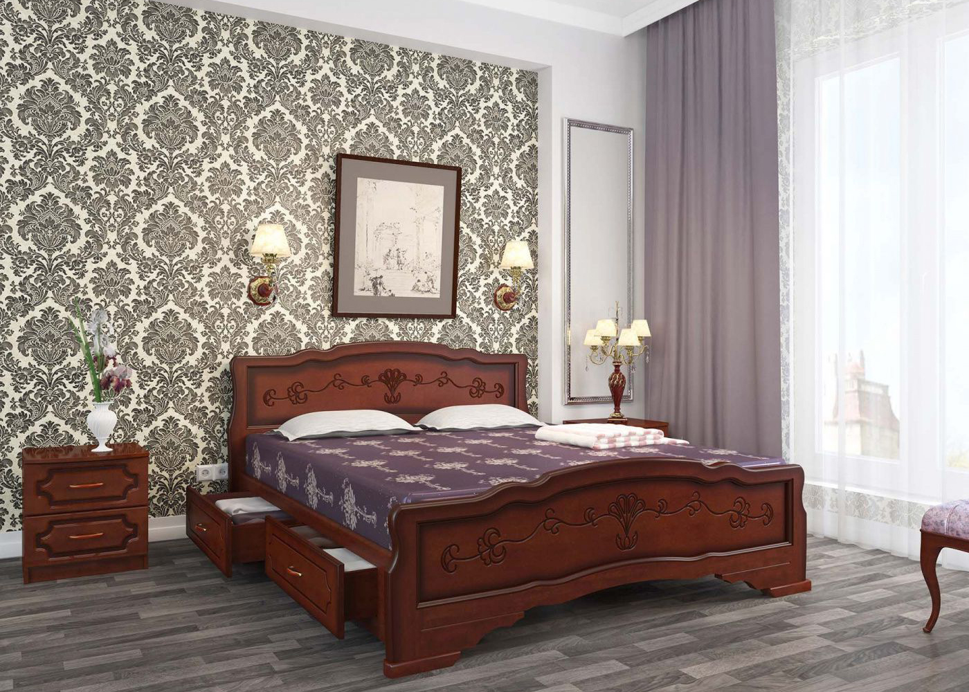 Карина-6 продается в разобранном состоянии и состоит из: головная спинка, ножная спинка и две двухметровые деревянные царги.