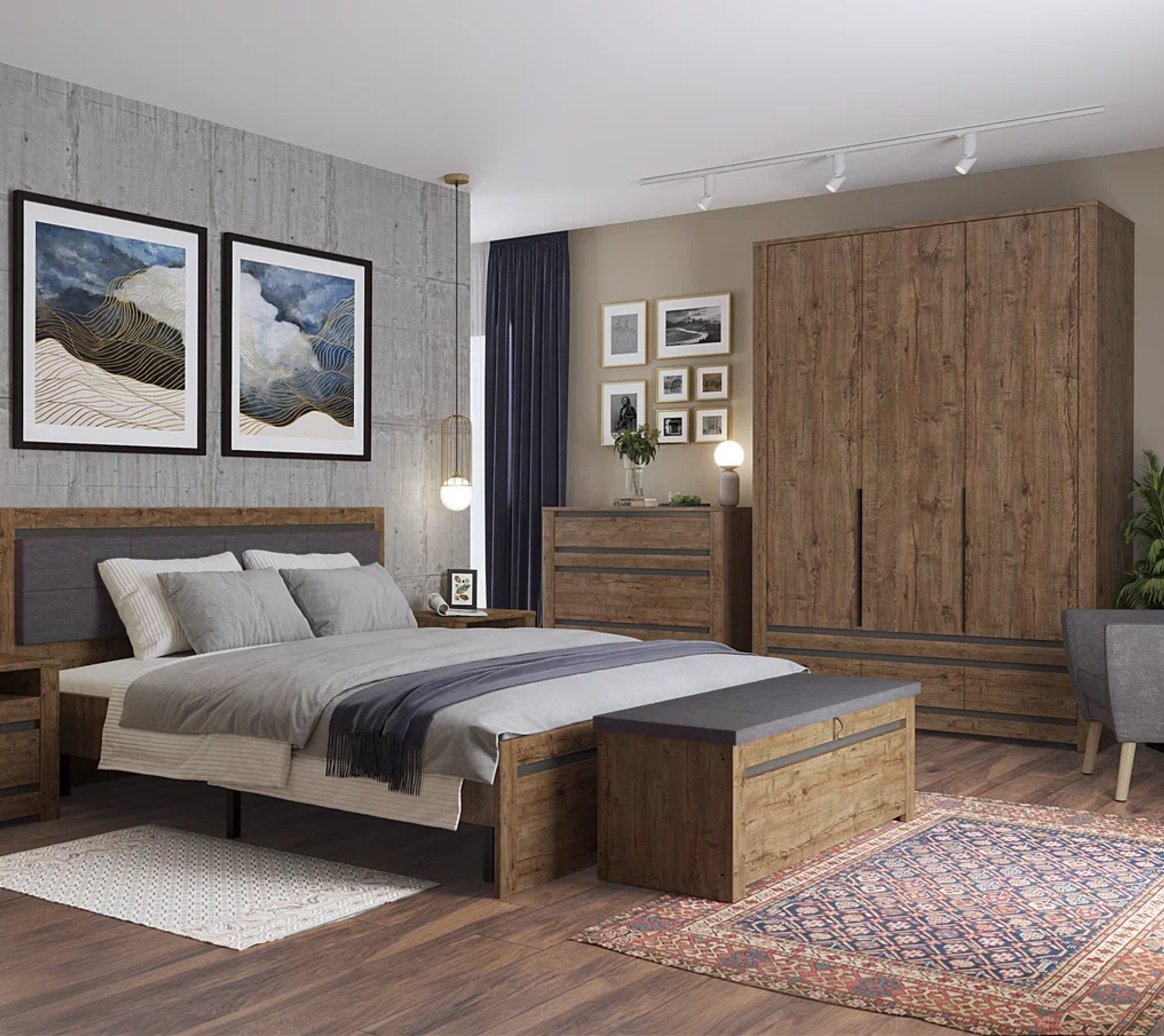 Благородная древесная фактура дополнена тёмными вставками. Кровать выполнена из ламинированной ДСП — материала, отличающегося своей износостойкостью.