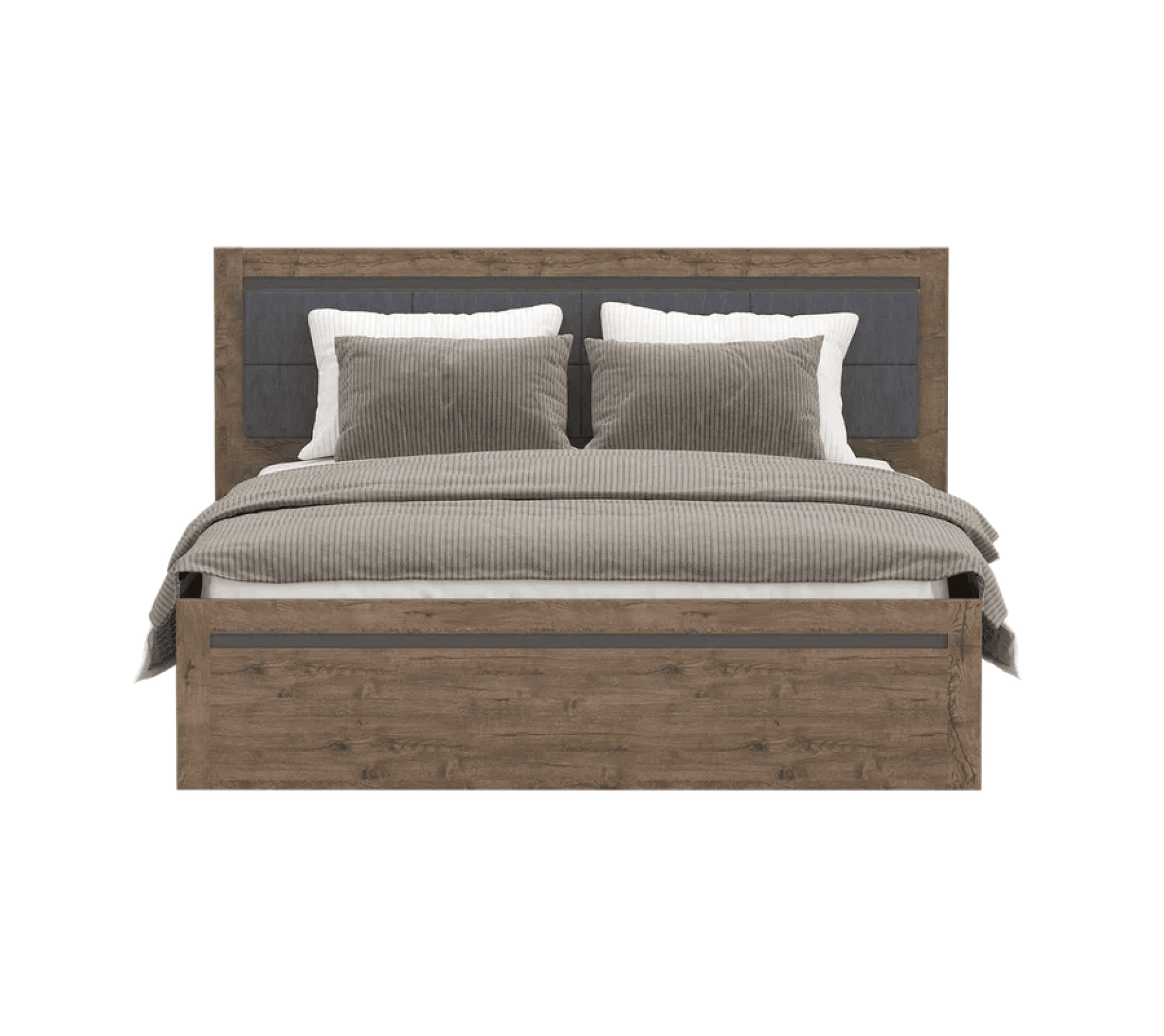 Благородная древесная фактура дополнена тёмными вставками. Кровать выполнена из ламинированной ДСП — материала, отличающегося своей износостойкостью.