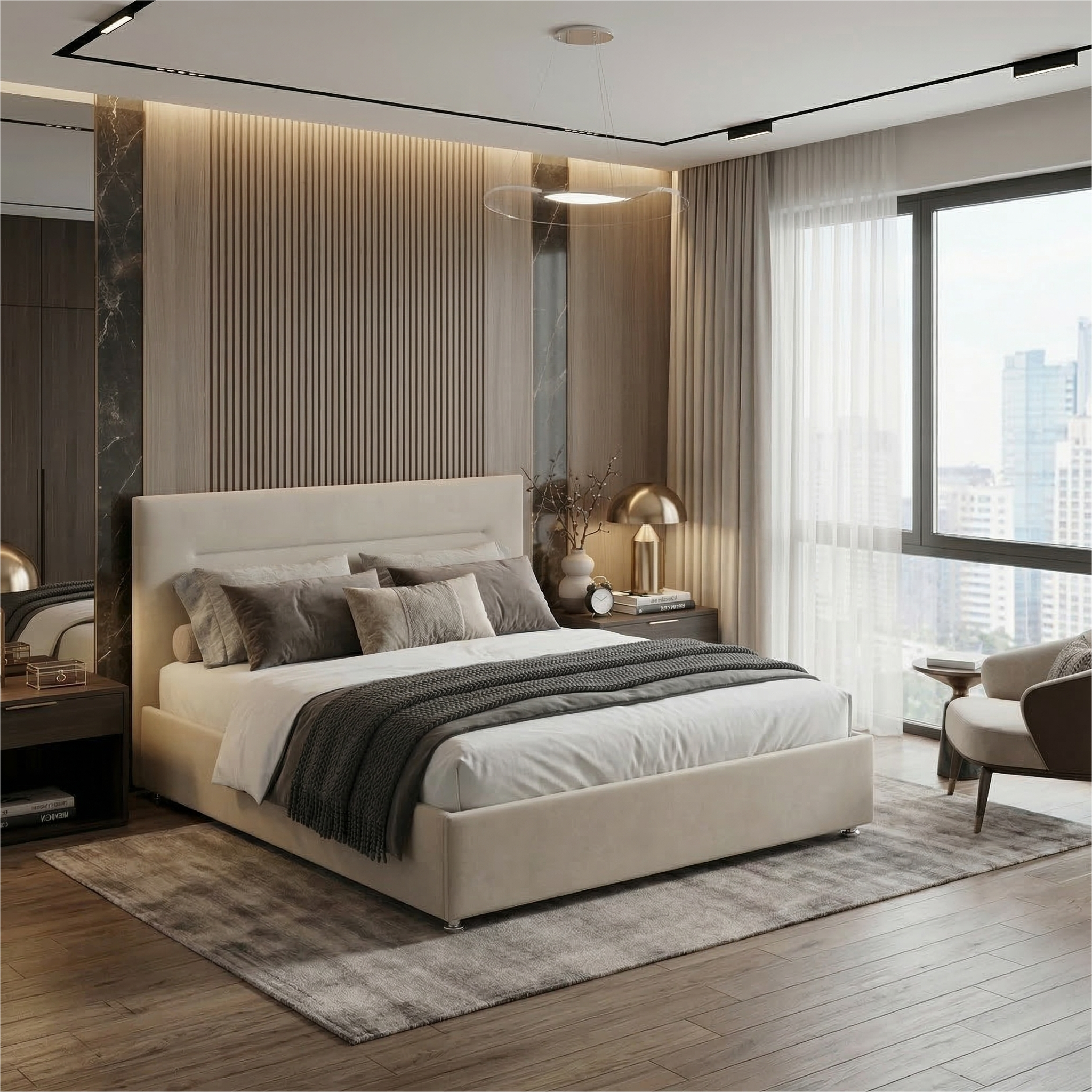 Современный и в тоже время универсальный дизайн спинки кровати с декоративной утяжкой по центру, позволяет ей стать неотъемлемой частью любого интерьера.