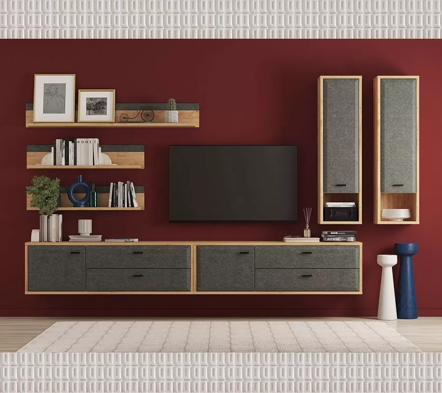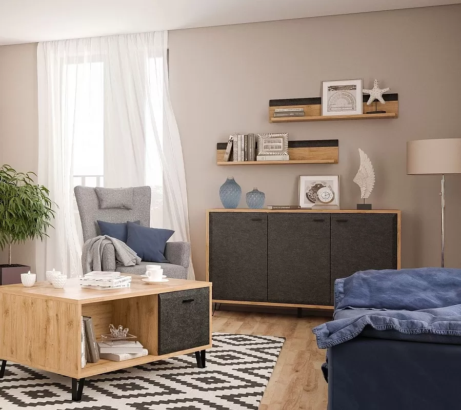 Образцом безупречной визуализации является поверхность в цвете дуб наварро и отделка графит. Настоящий хит коллекции «Грейс» ‑ древесный рисунок коричневого оттенка, подчеркнутый декоративной вставкой в цвете графит. Модель с таким оформлением идеально вписывается в любой современный стиль: модерн, минимализм и хай-тек.