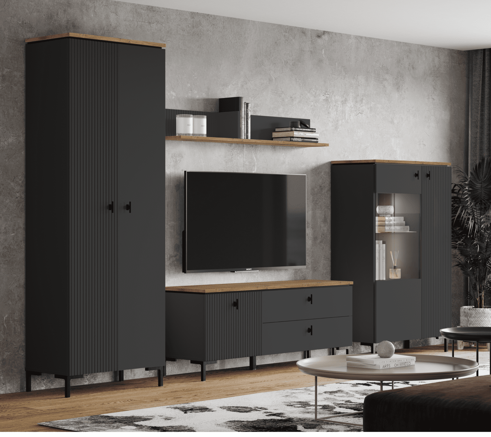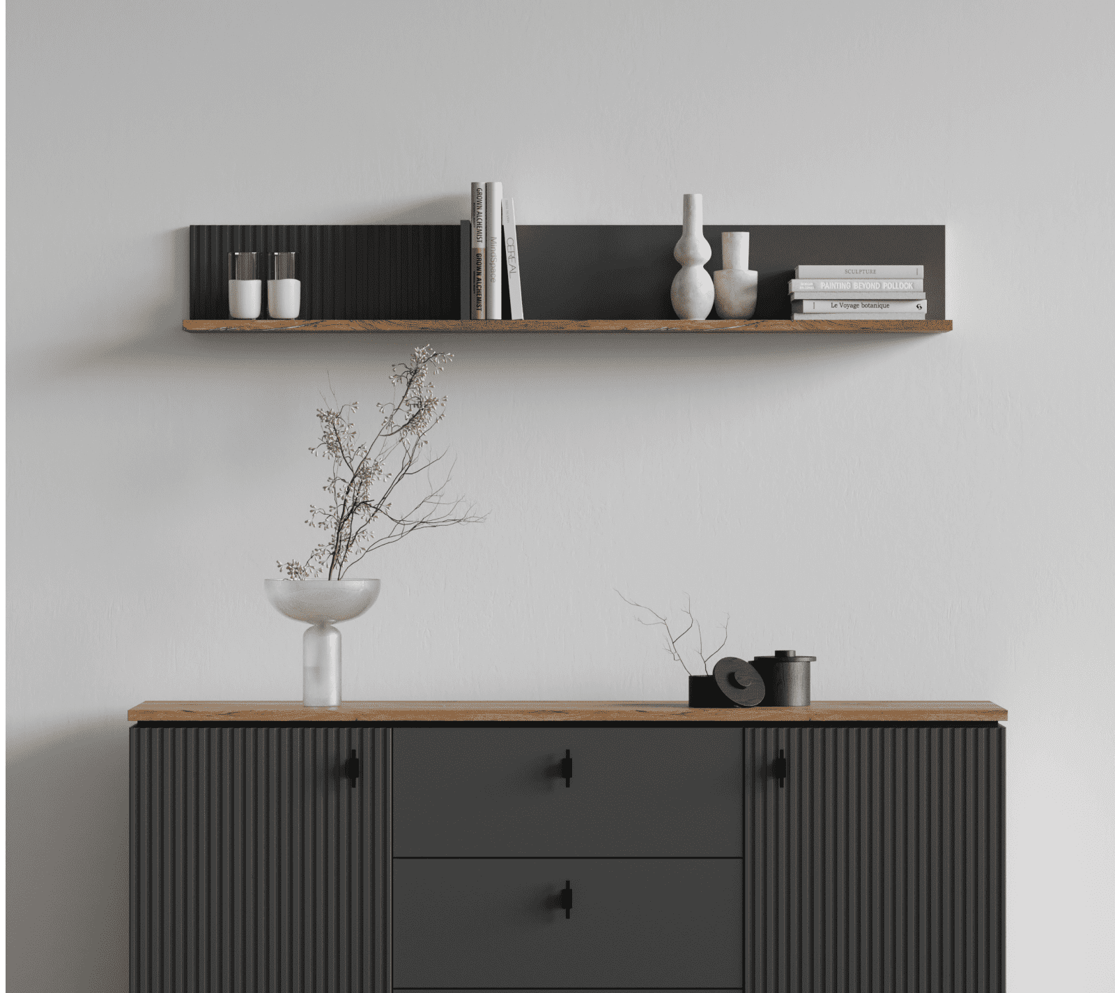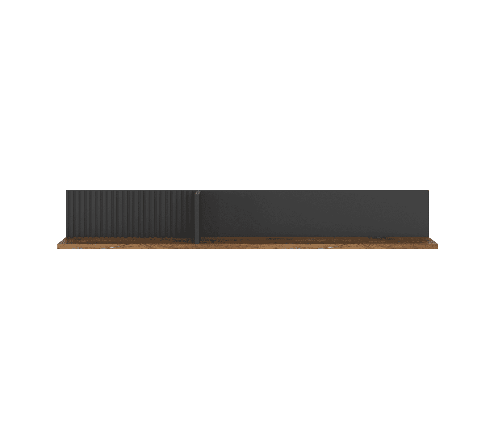 Просторная открытая полка состоит из двух отделов: одна с рельефной матовой стенкой, вторая — с матовой гладкой. Горизонтальная поверхность в цвете дуб нокс придает глубину интерьеру.