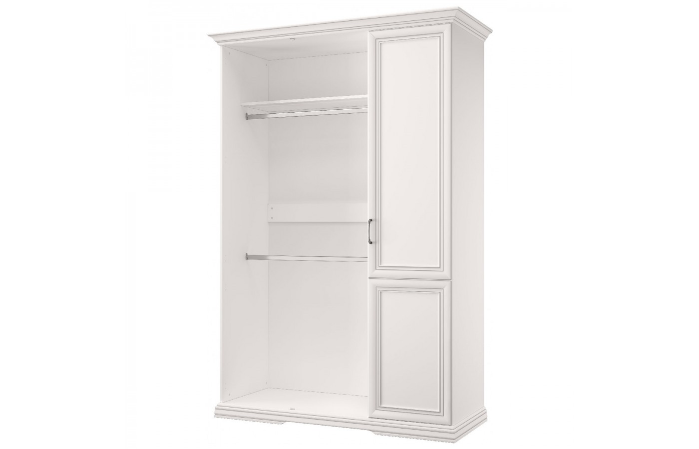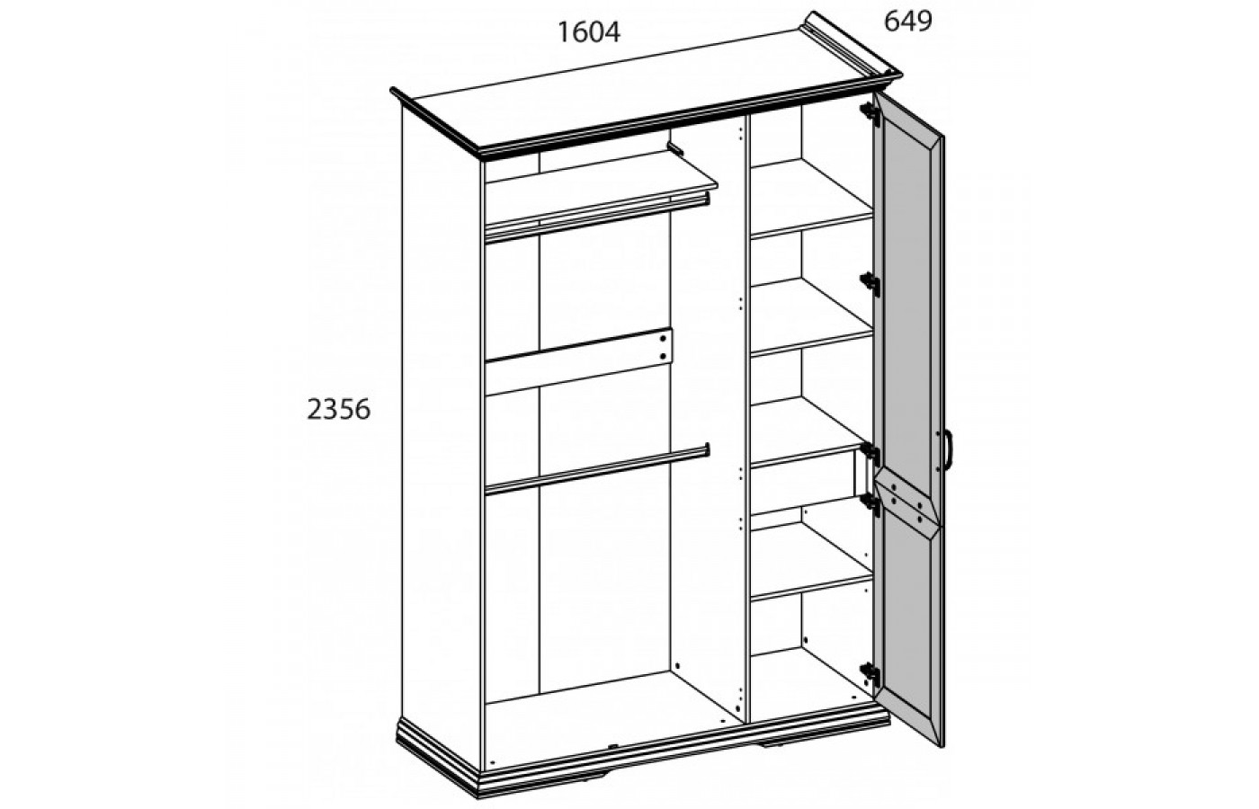 Конструкция корпуса шкафа 3DG прямая, представляет собой боковые стенки, верхний и нижний щит, внутреннее наполнение – одно отделение с полками ЛДСП, одно гардеробное отделение с полкой ЛДСП за глухой дверью (в комплект входит один сборный фасад) и двумя стационарными продольными штангами.