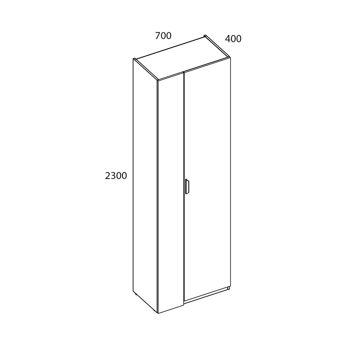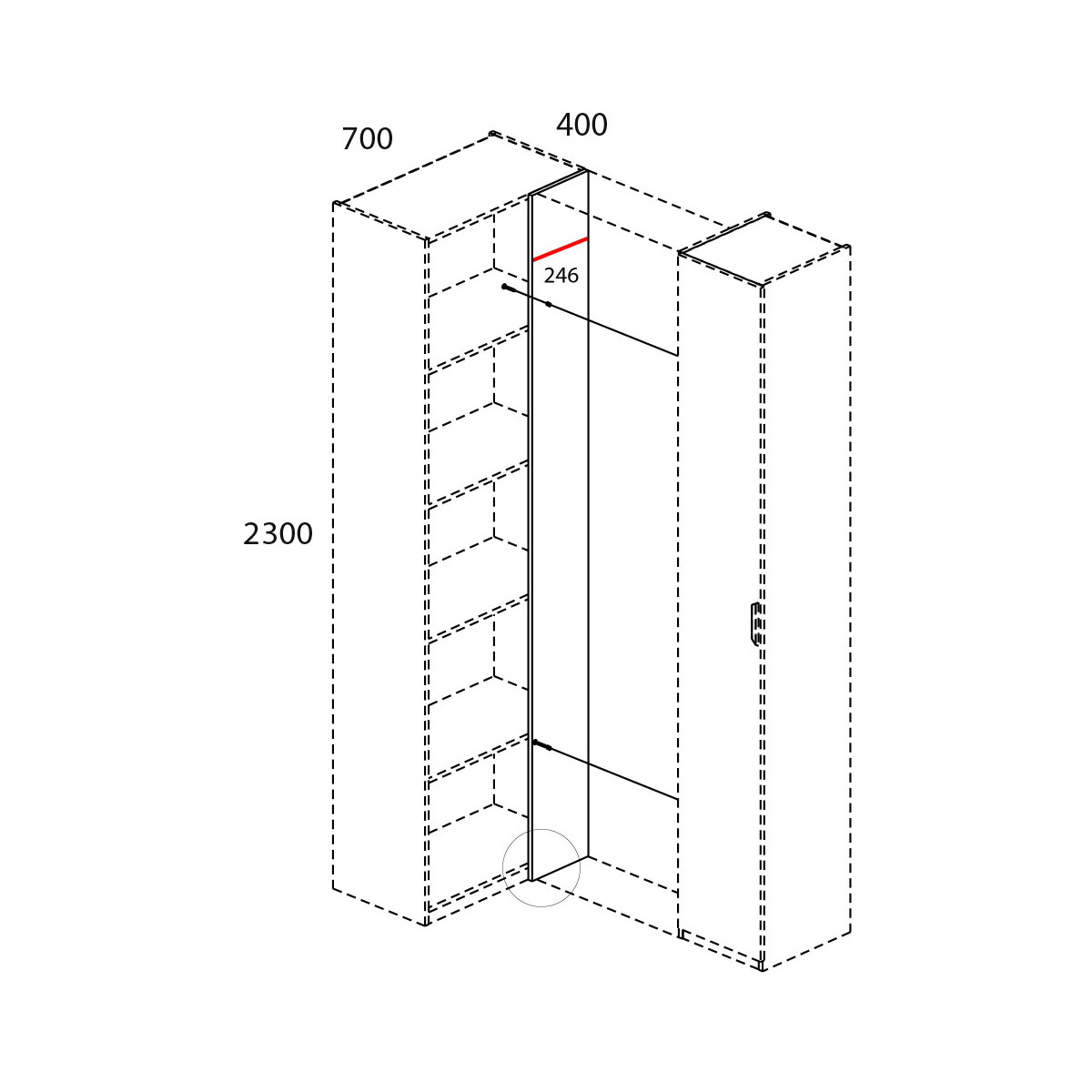 Дверь распашная, крепится на петли к боковому корпусу изделия. Угловая композиция получается за счёт присоединения элементов шкафной группы глубиной 400 мм к стенке передней посредством крепежа.