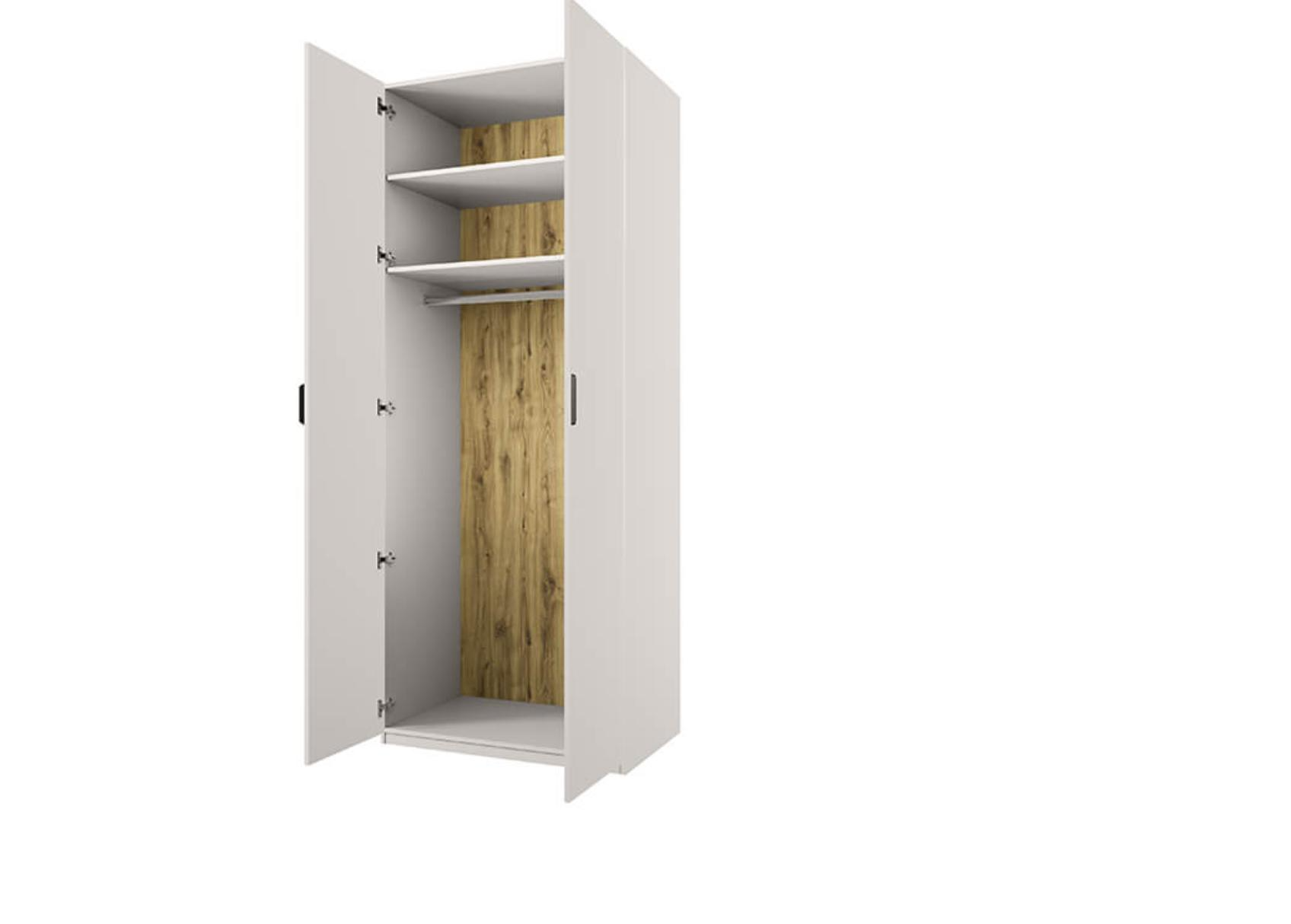 Конструкция шкафа 2DG прямая, представляет одно гардеробное отделение (G) с двумя полками ЛДСП и одной стационарной штангой за двумя глухими дверями (2D).