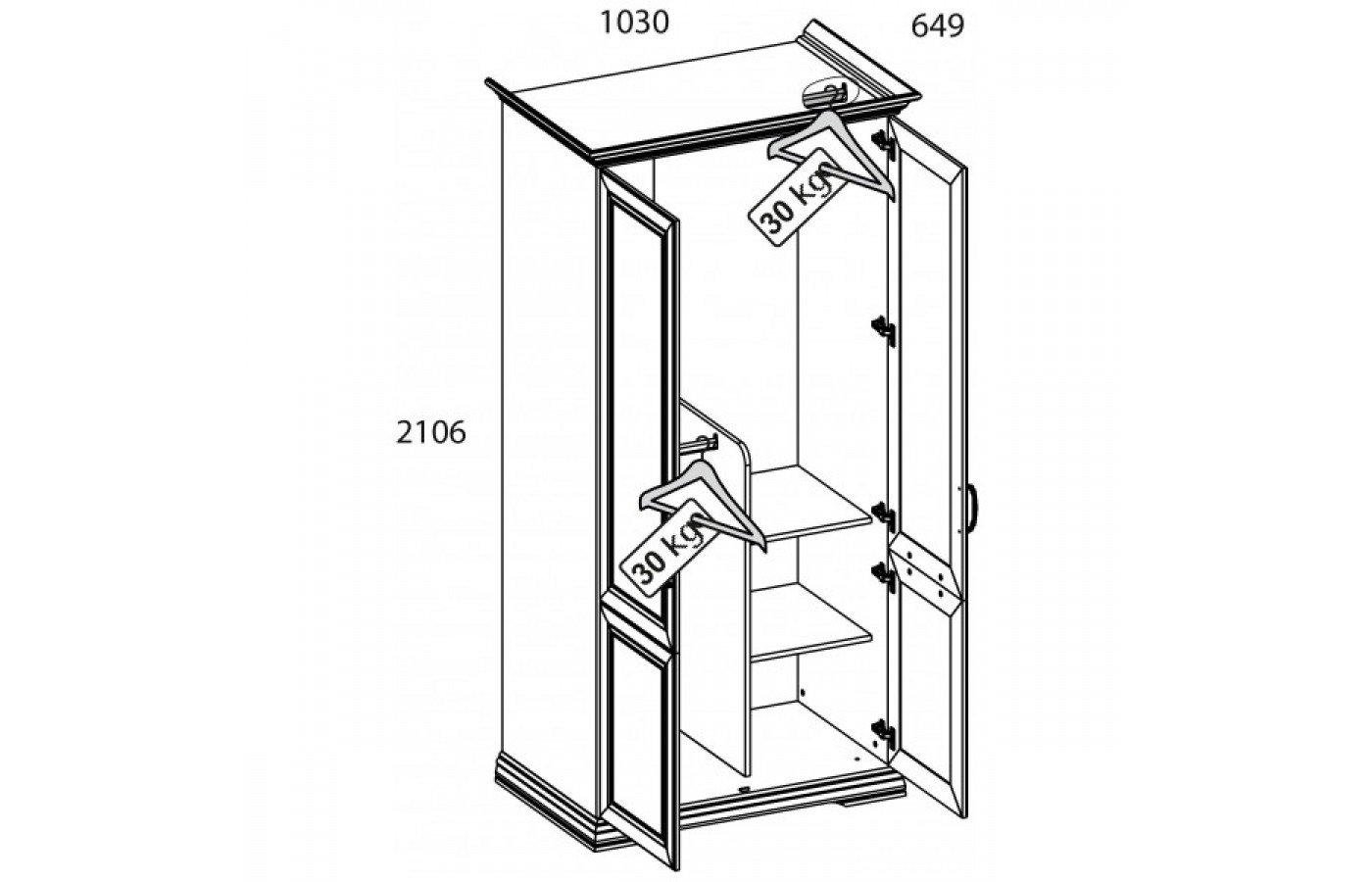 Конструкция шкафа 2DG прямая, представляет собой одно гардеробное отделение (G) с двумя полками ЛДСП, двумя стационарными продольными штангами (короткой и длинной), перегородкой ЛДСП за двумя глухими дверями (2D).