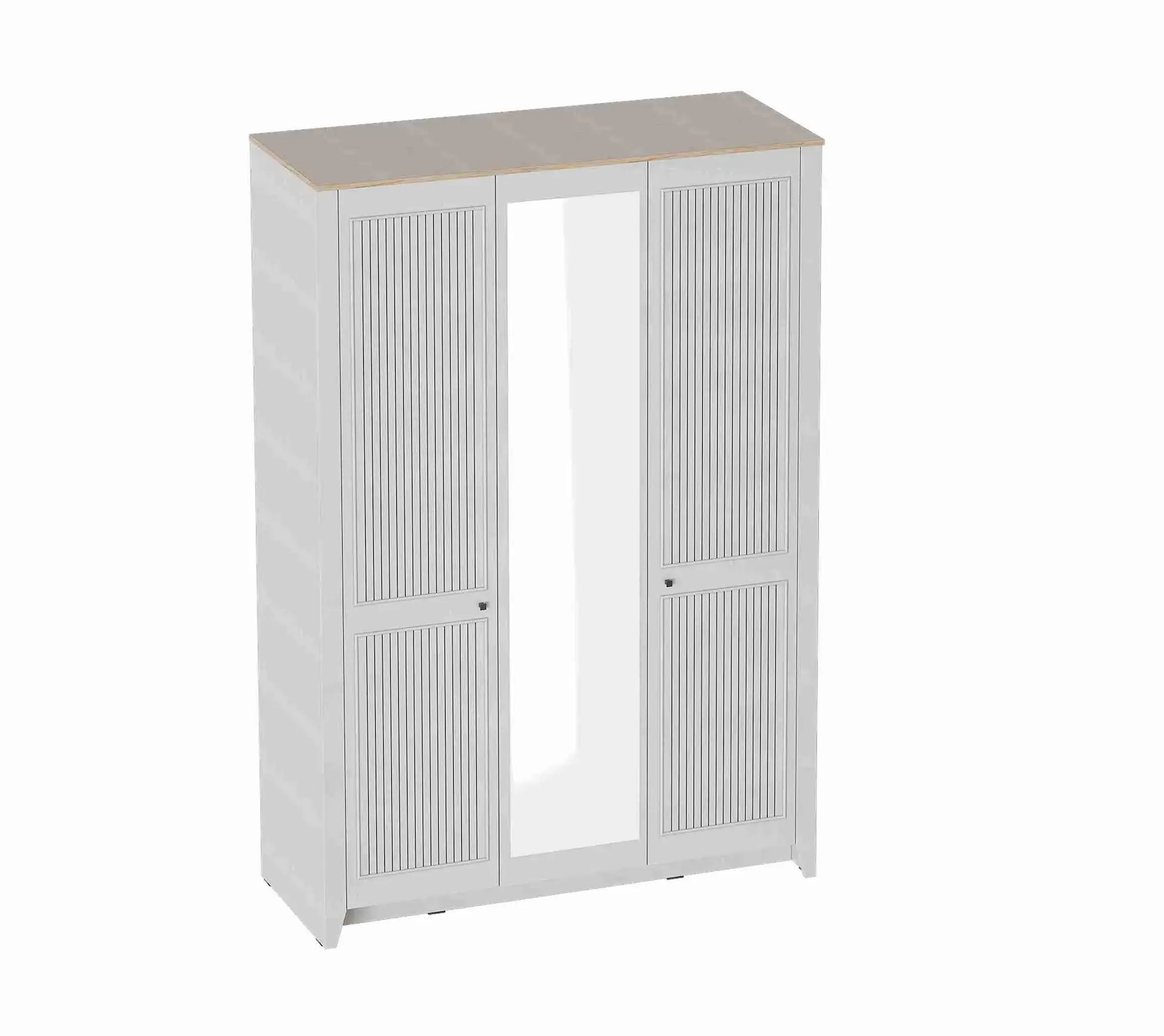 УФ-фотопечать полосок на фасадах в обрамлении пластиковых молдингов придает изделию оригинальный стиль современной классики. В центральной части шкафа расположена штанга для одежды, а также верхняя и нижняя полки, каждая из которых разделена на два отделения.
