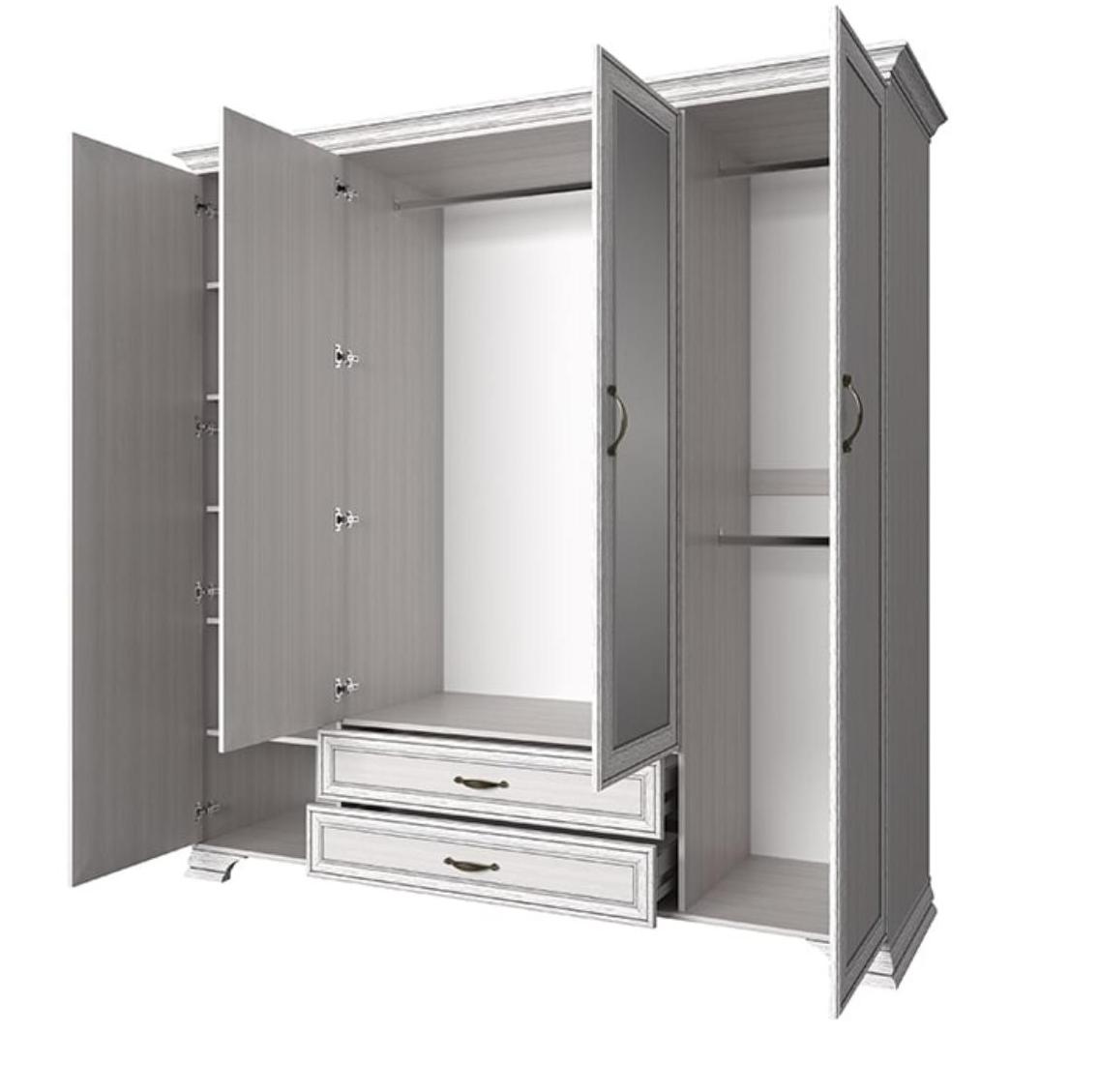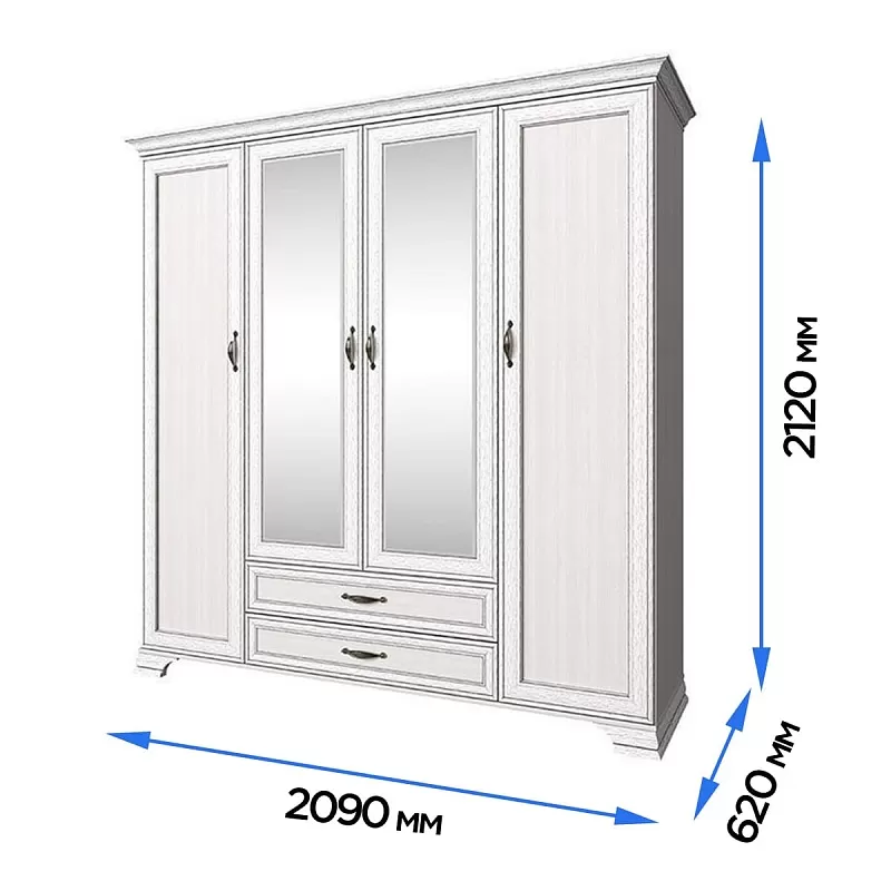 Высота шкафа Tiffany составляет 212 см, при ширине 209 см и глубине 62 см он превращается в мини-гардеробную и позволяет уместить большой объем одежды. Декорирование фасадов филенками и патинированной планкой позволяет с уверенностью использовать эту мебель в классических интерьерах. Шкаф на резных ножках с ручками в цвете серый глянец создан, чтобы дарить тепло и уют домашней обстановке.