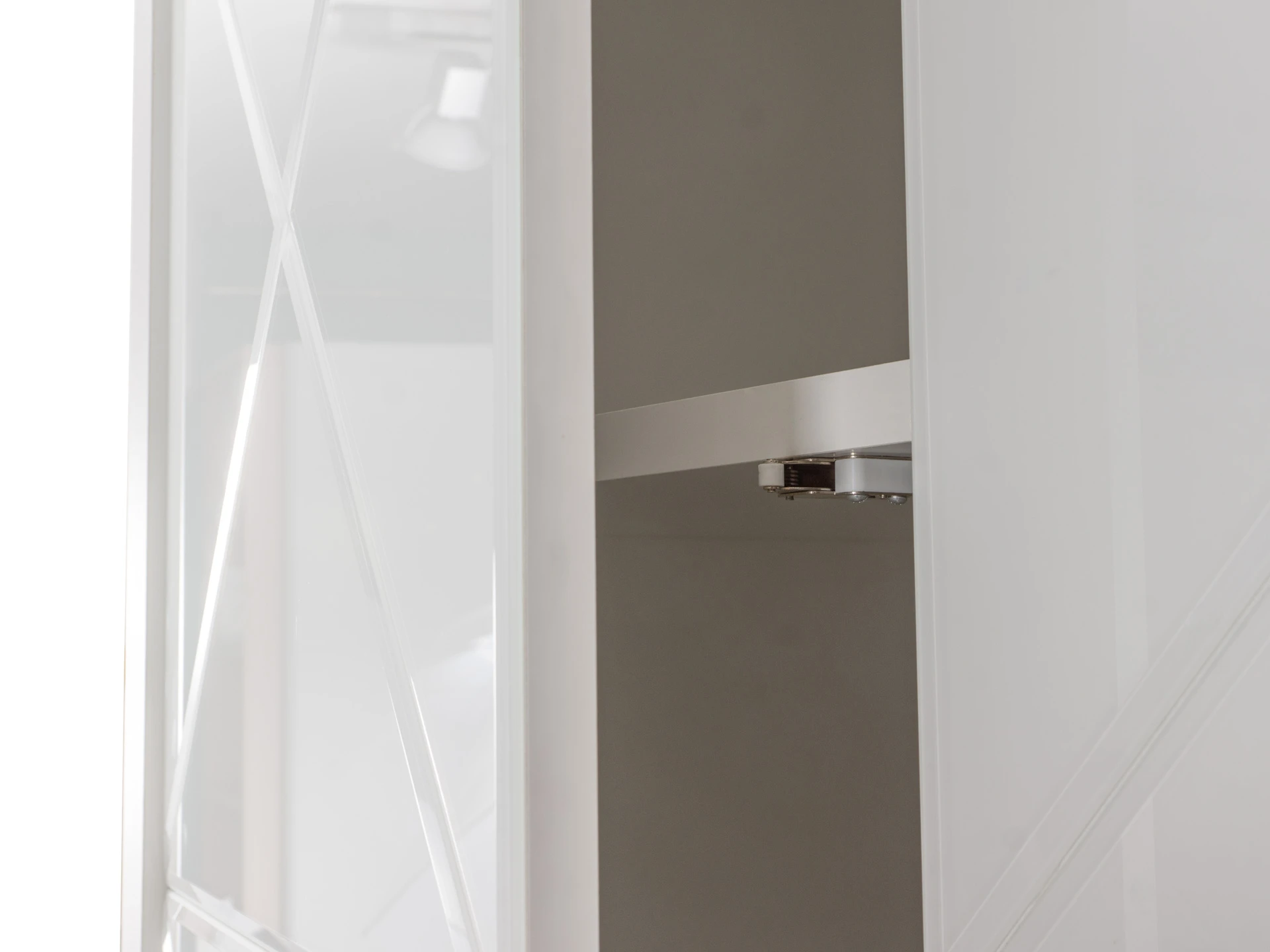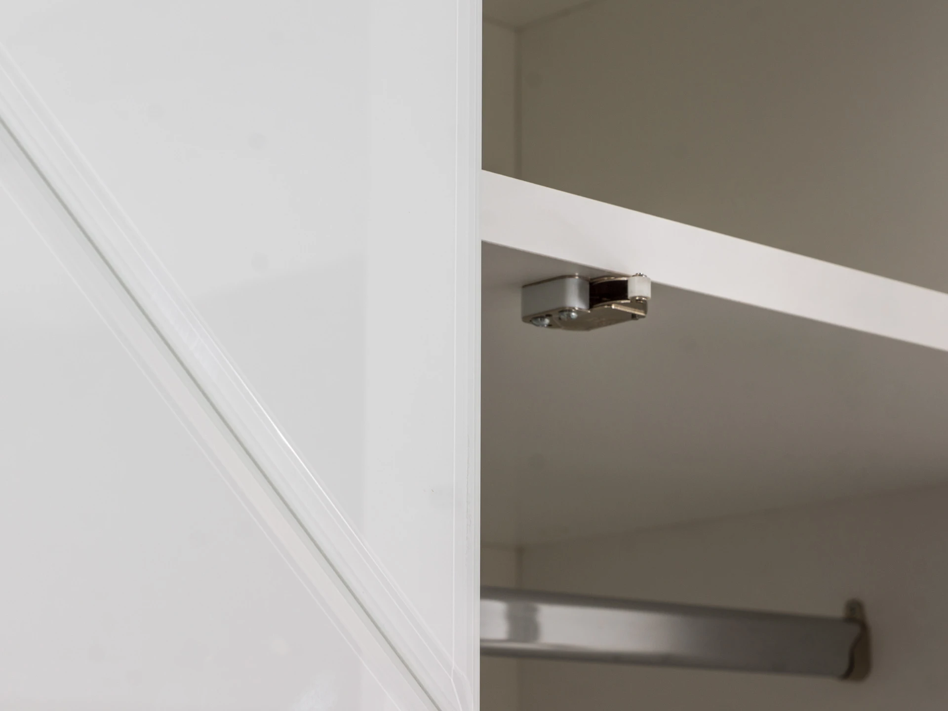 Шкаф оснащен продольной штангой и полкой с одной стороны и 4 полками с другой.