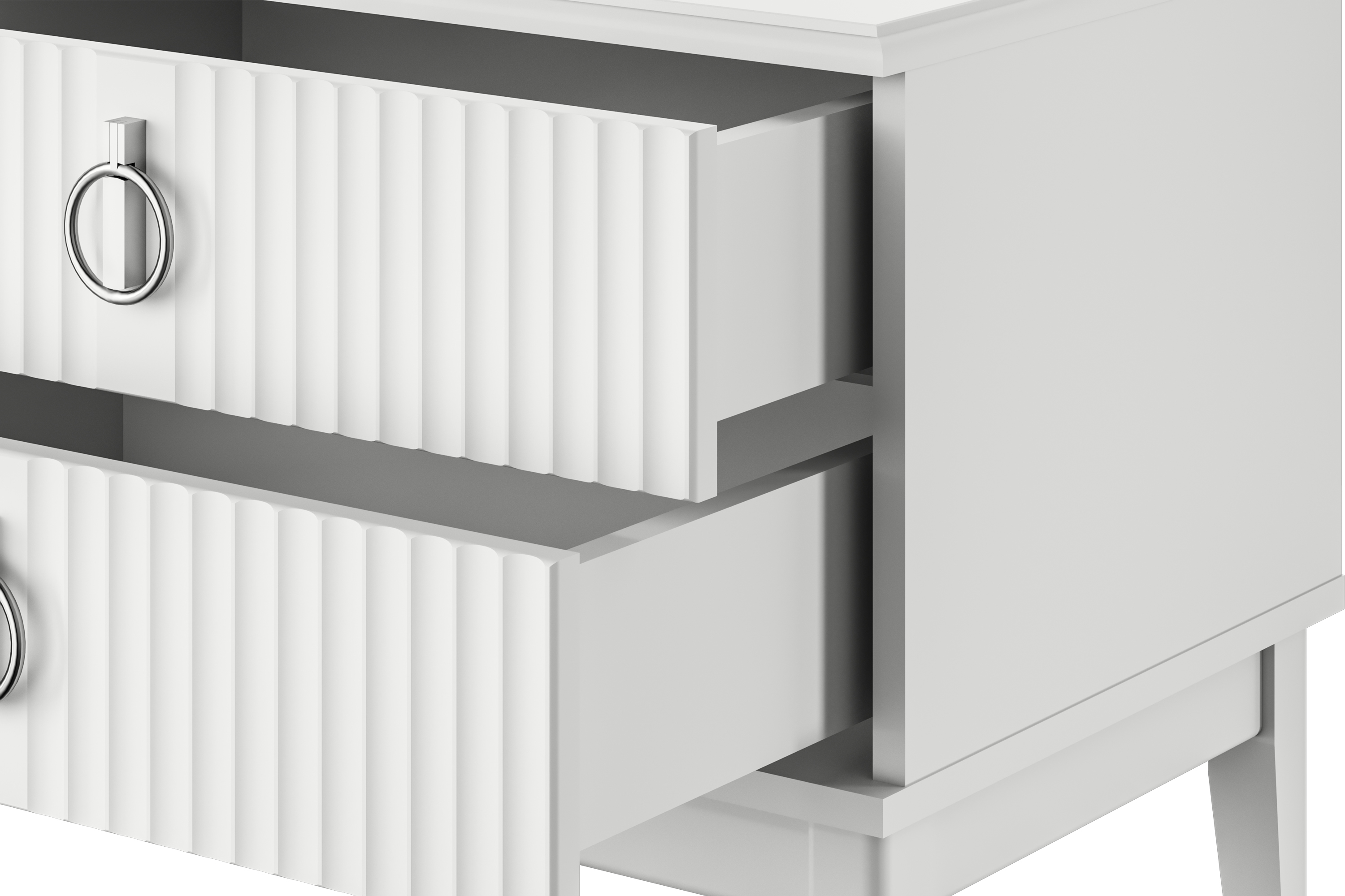 Фасады шкафа декорированы фрезеровкой, что придаёт ему стильный и оригинальный вид. Фурнитура включает петли с доводчиками, обеспечивающие плавное и бесшумное закрывание дверей.
