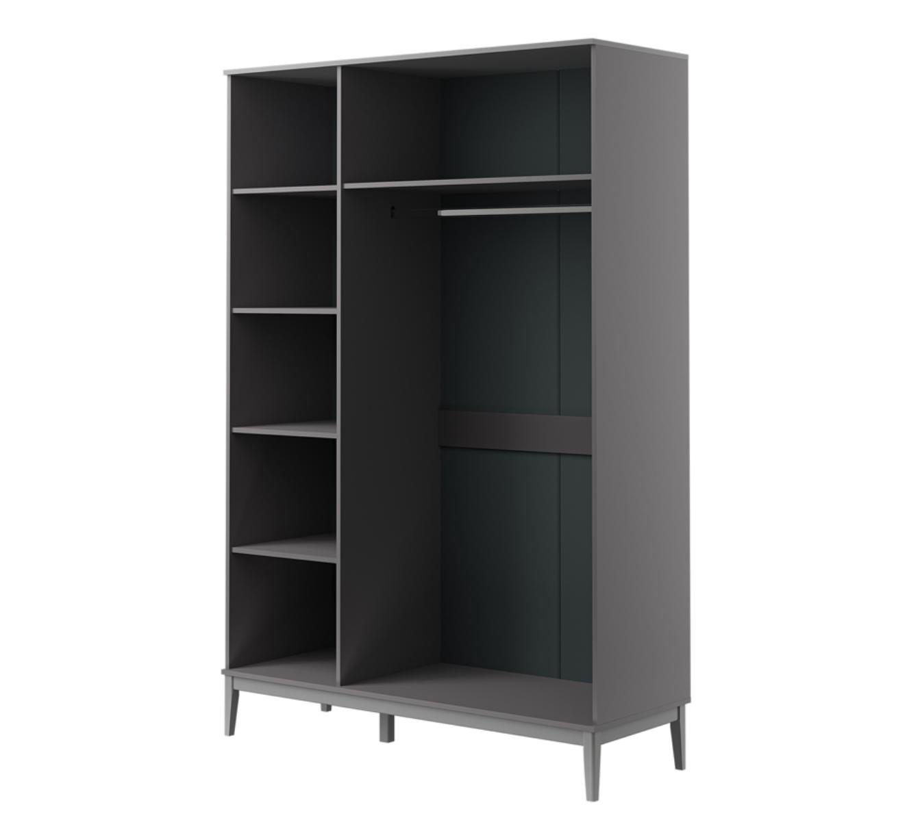 Шкаф имеет две секции: за левой секцией расположены полки, а за правой - штанга для одежды.