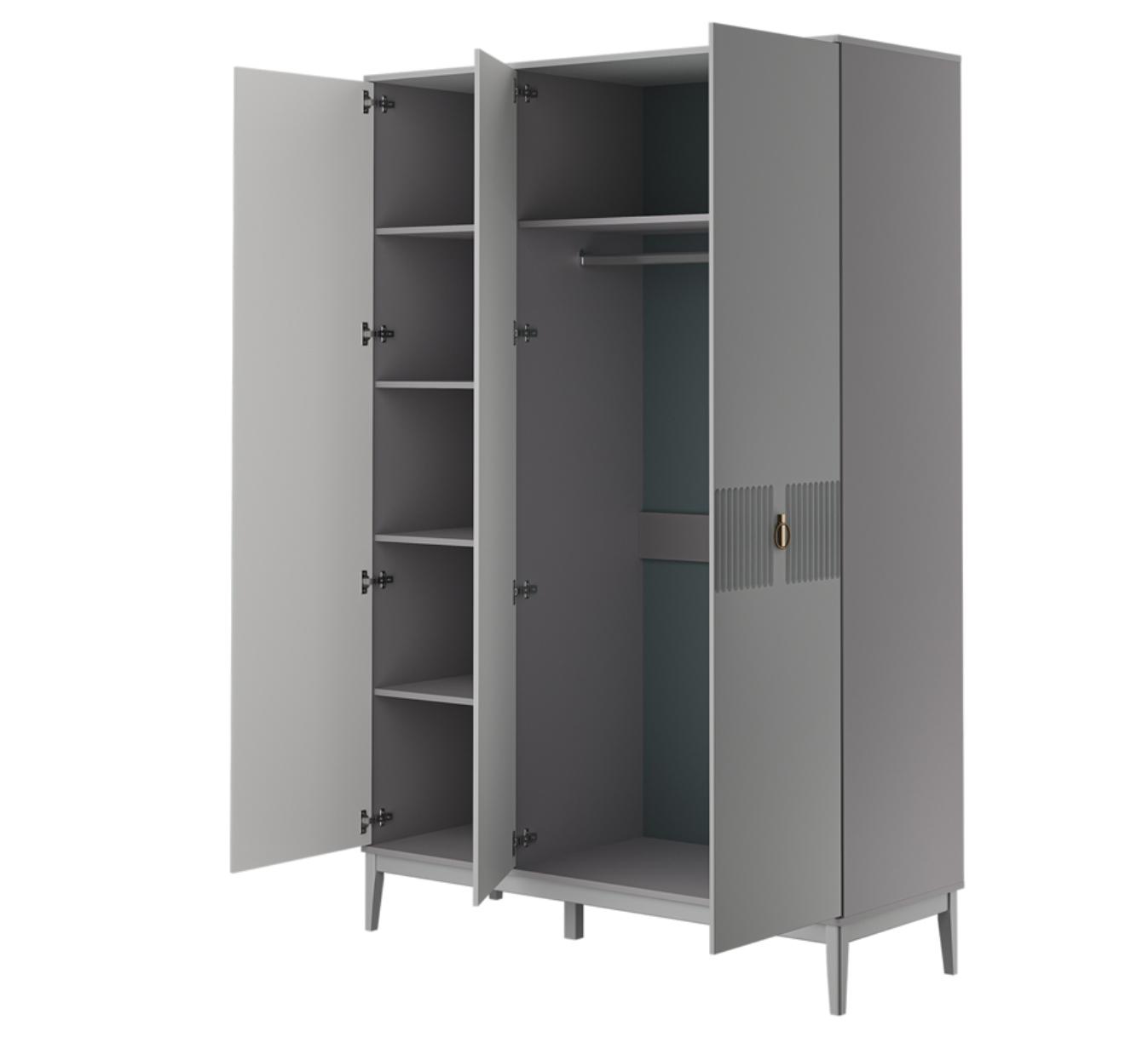 Фасады шкафа декорированы фрезеровкой, что придаёт ему стильный и оригинальный вид. Фурнитура включает петли с доводчиками, обеспечивающие плавное и бесшумное закрывание дверей.
