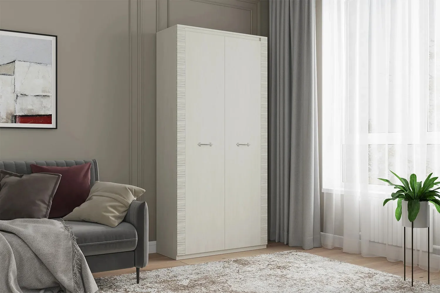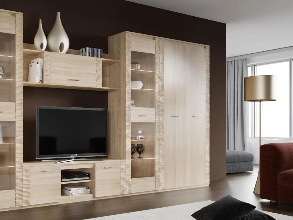Двухдверный шкаф оснащен двумя отделениями: для белья с четырьмя съёмными и центральной жёсткой полкой; платяное с жесткой полкой и продольной стальной штангой. В колпаке шкафа имеется паз для светильника, входящего в комплект. Блок питания приобретается отдельно, и рассчитан на подключение шести светильников.