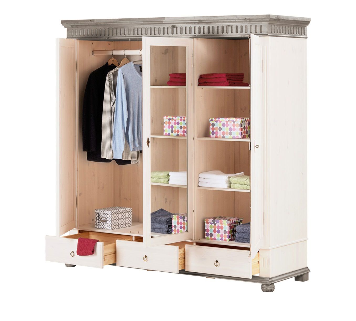 Вместительный трехдверный шкаф. Оформление дверей шкафа, необычная фурнитура и карниз с резным рисунком подчеркивают нотки скандинавского стиля в изделии. Подойдет для детской, спальни, а также для просторной прихожей. Изделие может быть доукомплектовано встраиваемыми полками.