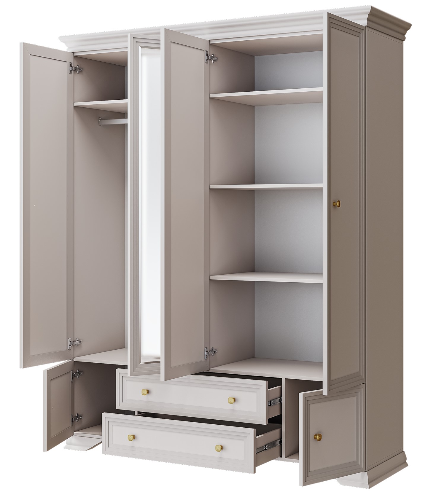 Модель оснащена четырьмя дверцами, установленными на петли с доводчиком, что гарантирует плавное и аккуратное закрывание. Внутреннее пространство включает две жёсткие полки, две вкладные полки, шесть ниш и два выдвижных ящика с шариковыми направляющими полного выдвижения — идеальное решение для гибкой организации хранения.