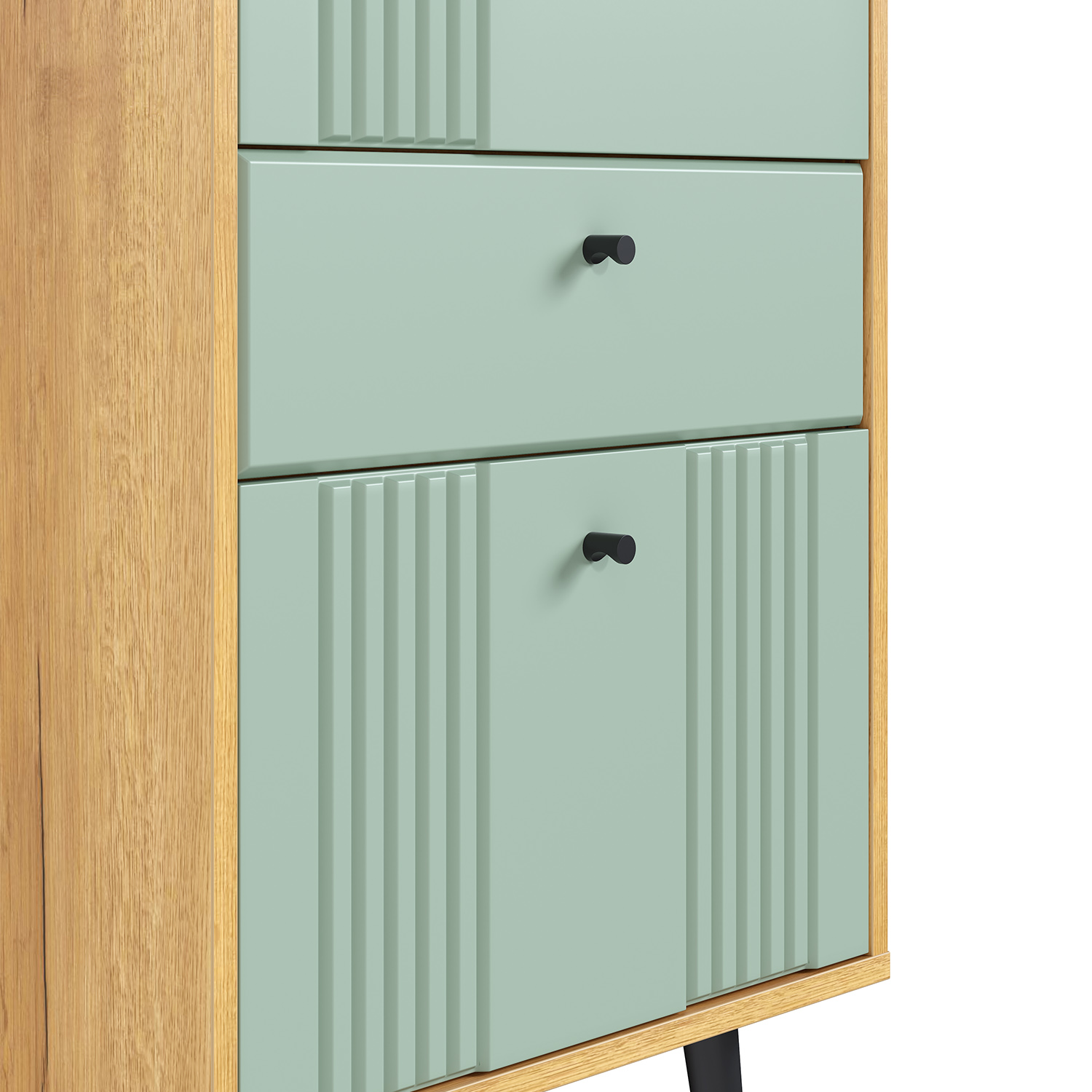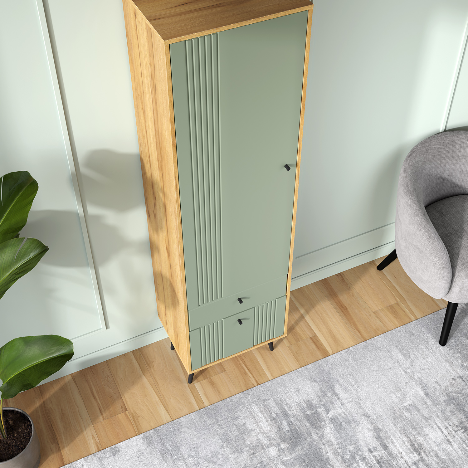 - «Дуб крафт золотой» + «Серо‑зелёный» — современное сочетание, создающее свежий, актуальный образ с благородным контрастом.